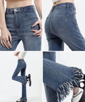 ハイウエスト スキニーデニムパンツ 着やせ カジュアル ロングパンツ おしゃれ 裾フリンジ ジーパン 細身 スリム 韓国
