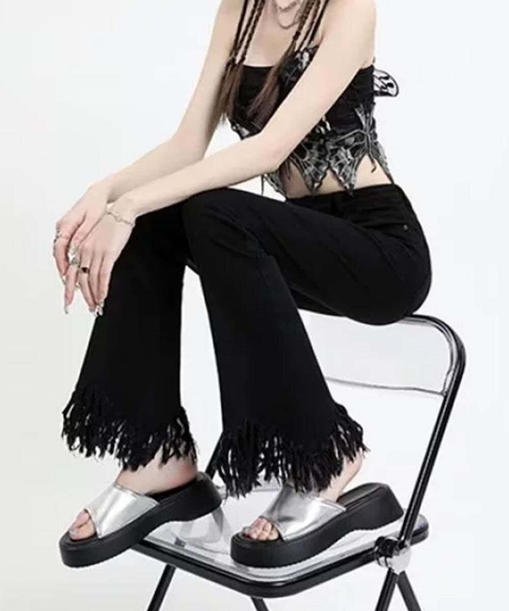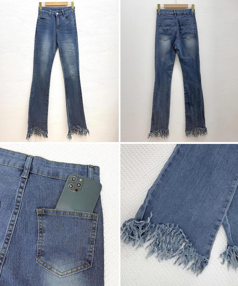 美脚を引き立てる魅力的な裾フリンジデニムフレアパンツ