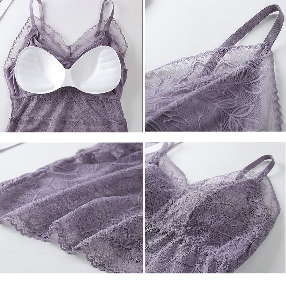 取り外し可能なカップ付きでブラ要らずに1枚で着られる総柄レースキャミソール