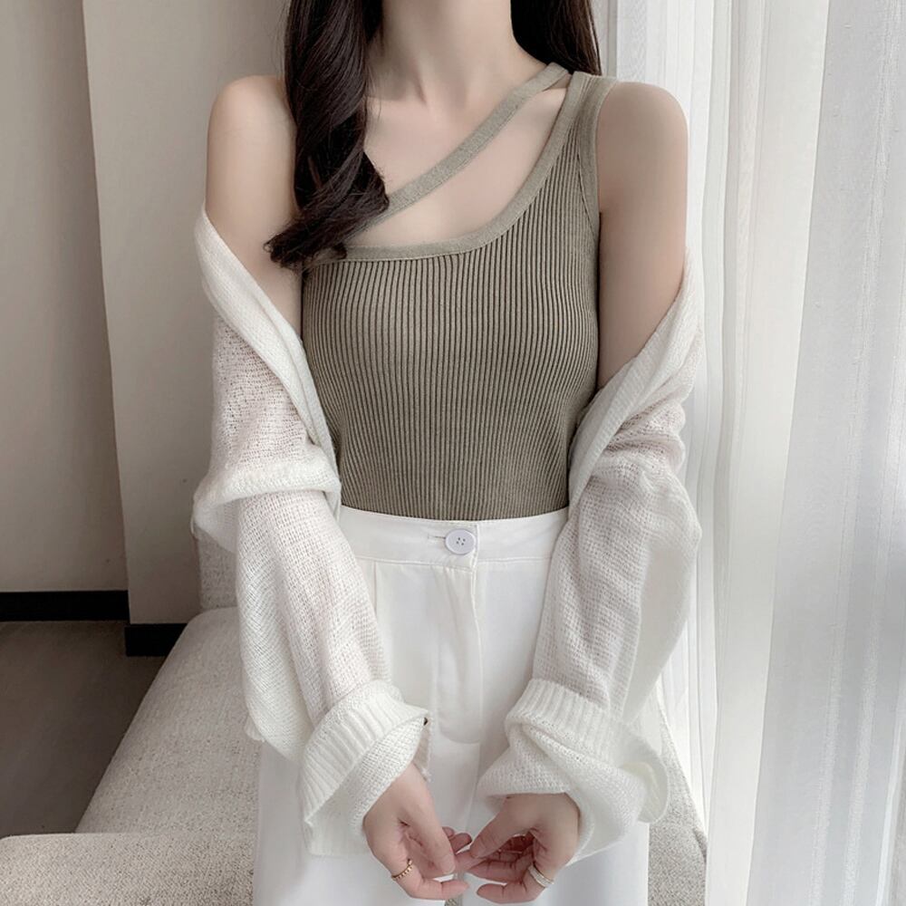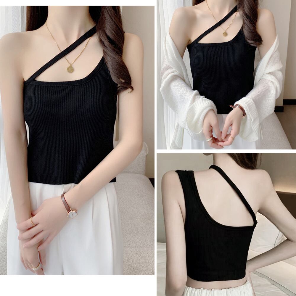 ワンショルダー トップス へそ出し キャミソール 韓国ファッション 重ね着 リブニット セクシー
