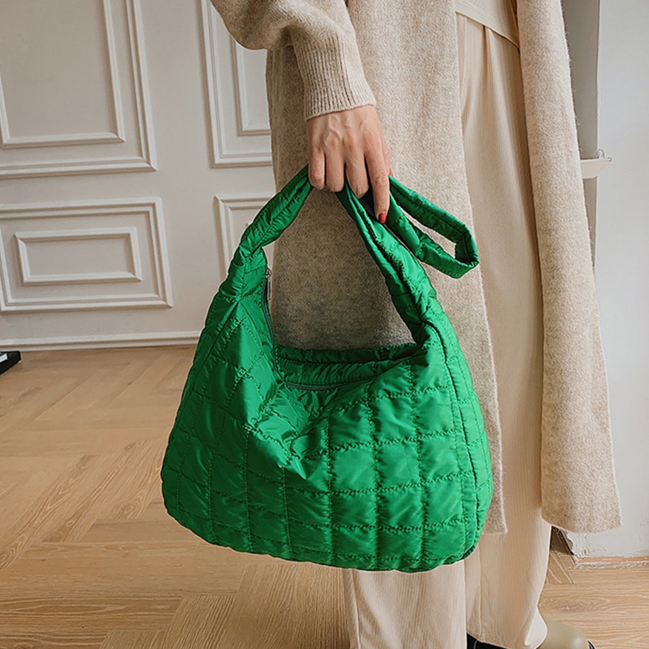 くったりと柔らかい綿入り、ナイロン素材を使用し、キルティング模様で落ち着いた雰囲気のショルダーバッグ