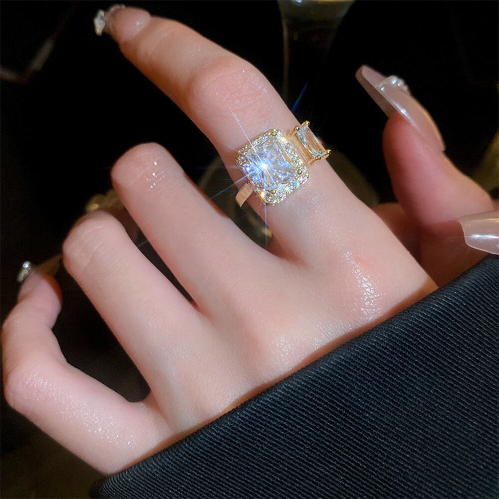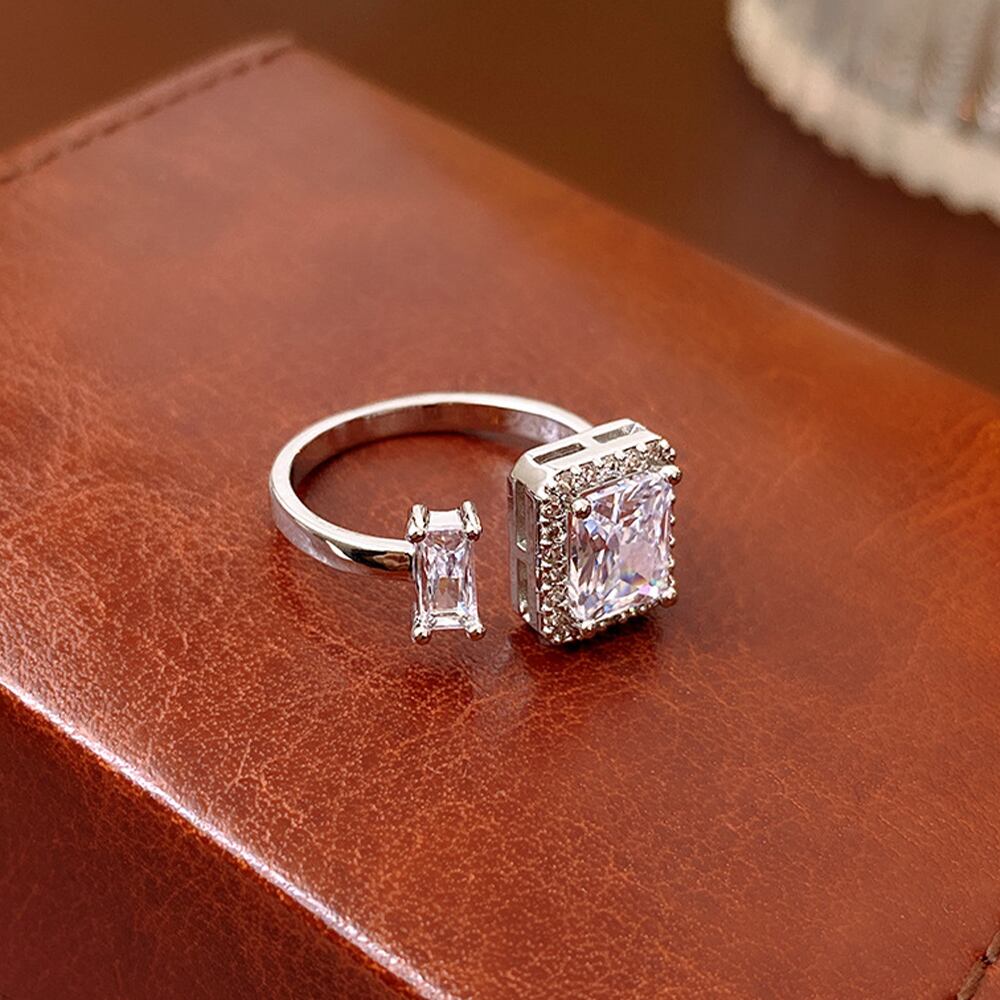 透明感のある煌めきが上品な雰囲気を放つ、端正なスクエア型フェイクダイヤはシャープで洗練された印象を与えるフリーサイズリング