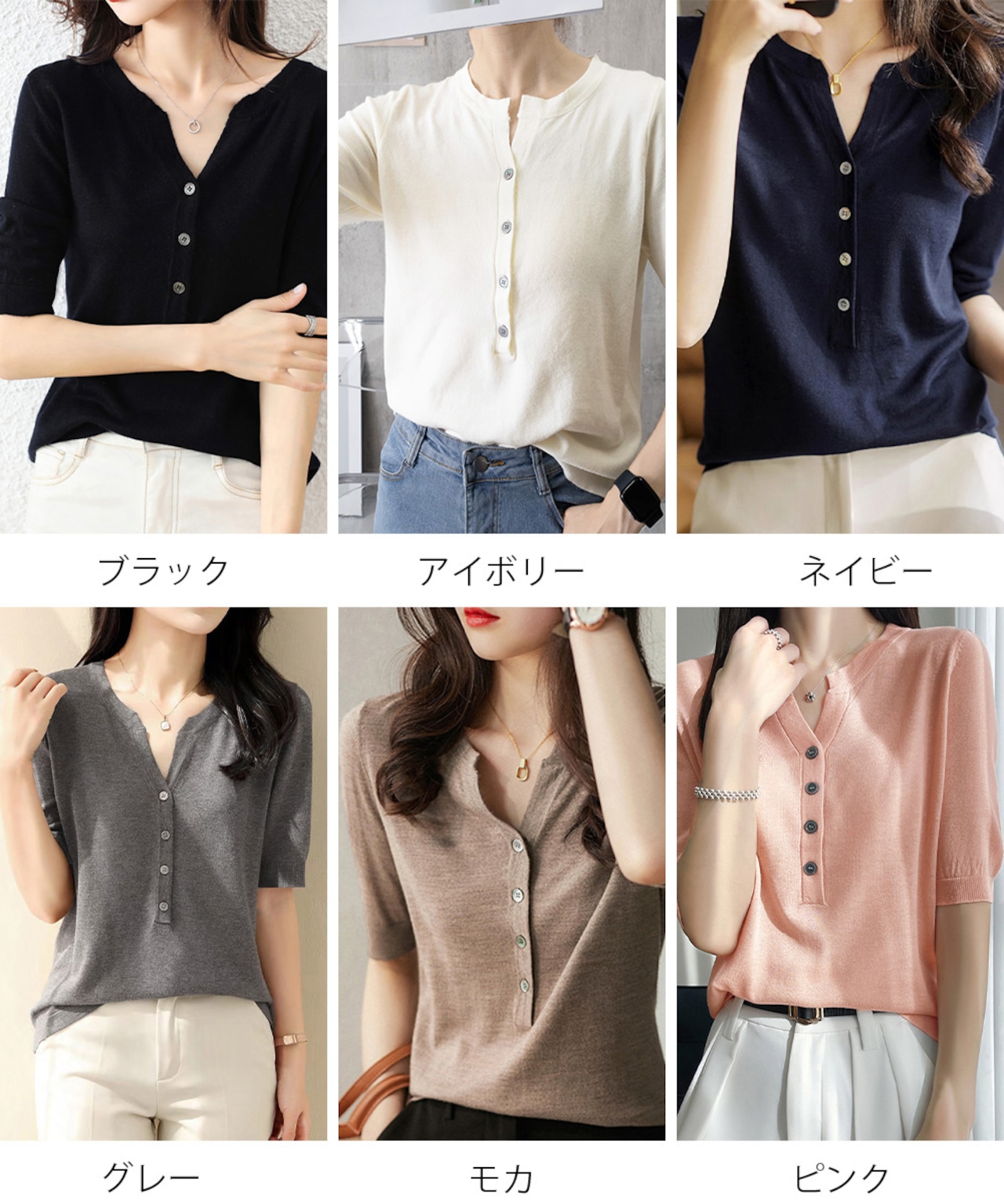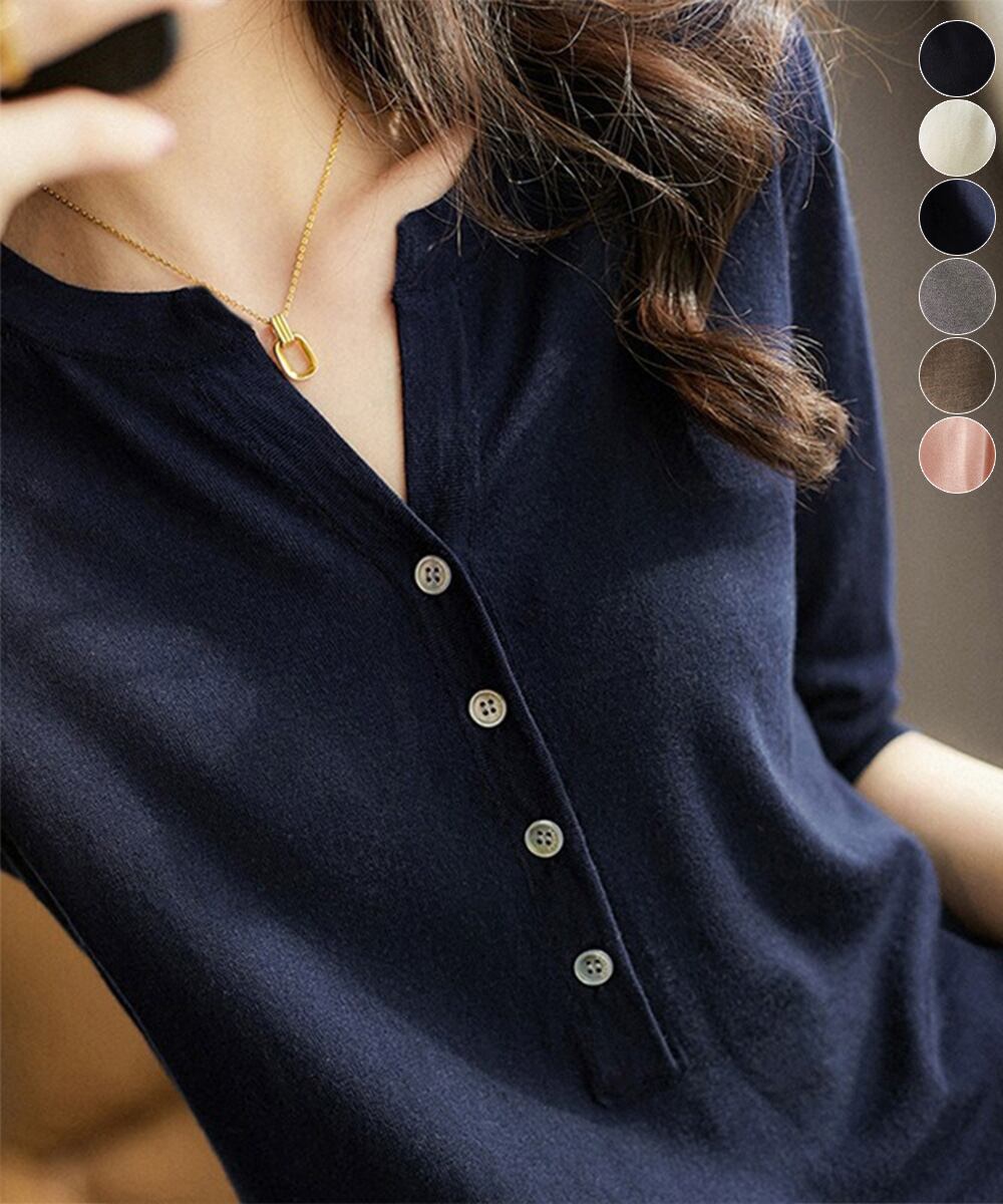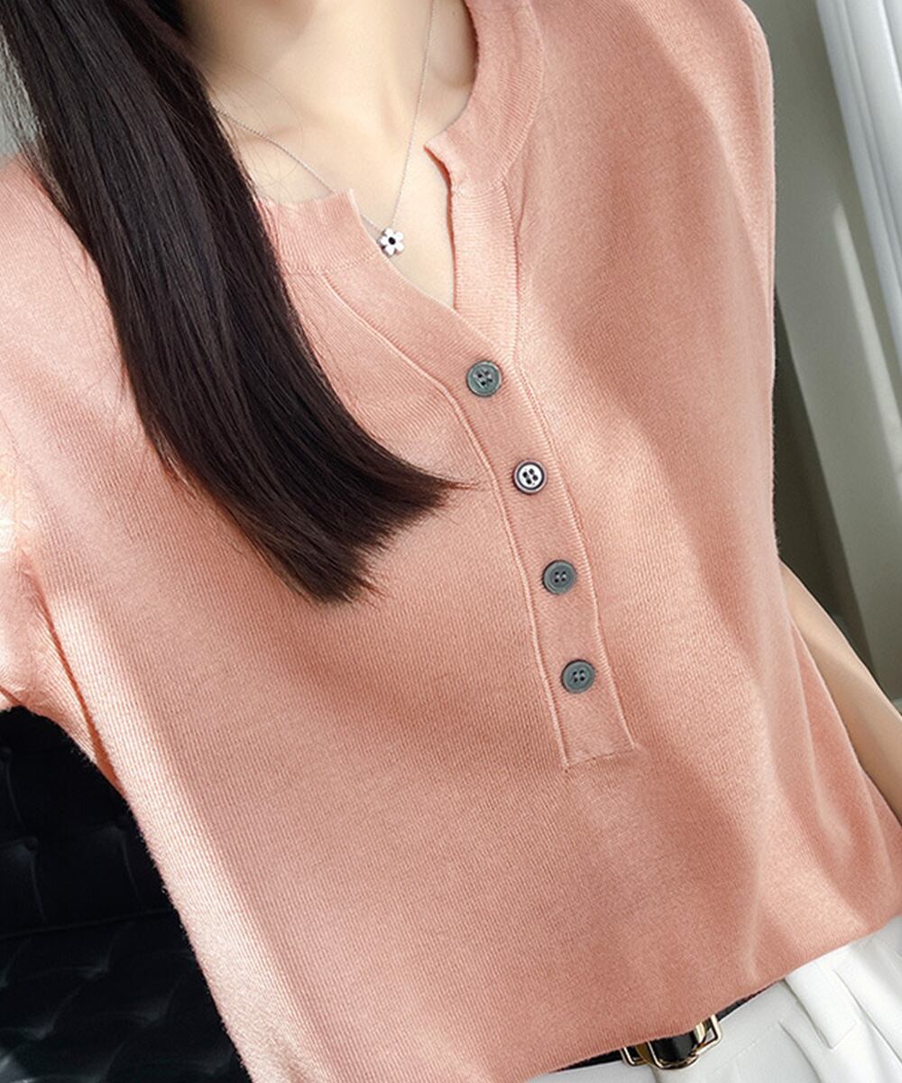 レディース ハーフボタン ニットカットソー 5分袖 薄手プルオーバー 大人可愛い 無地春秋夏トップス 半袖 着やせニット