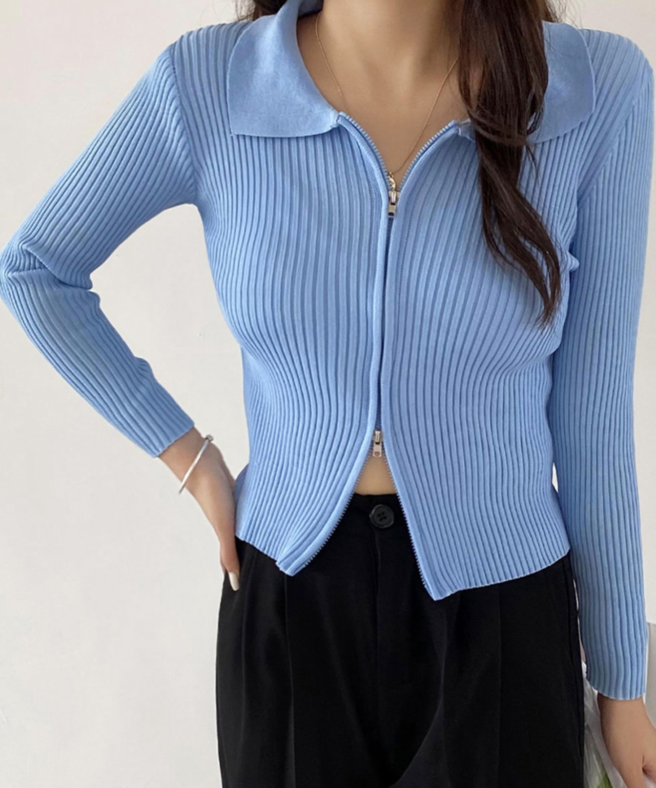 ニットセーター 前開き フィット感 きれいめ フロントZIP ショート丈 Vネック 長袖ニットアウター 無地 オルチャン