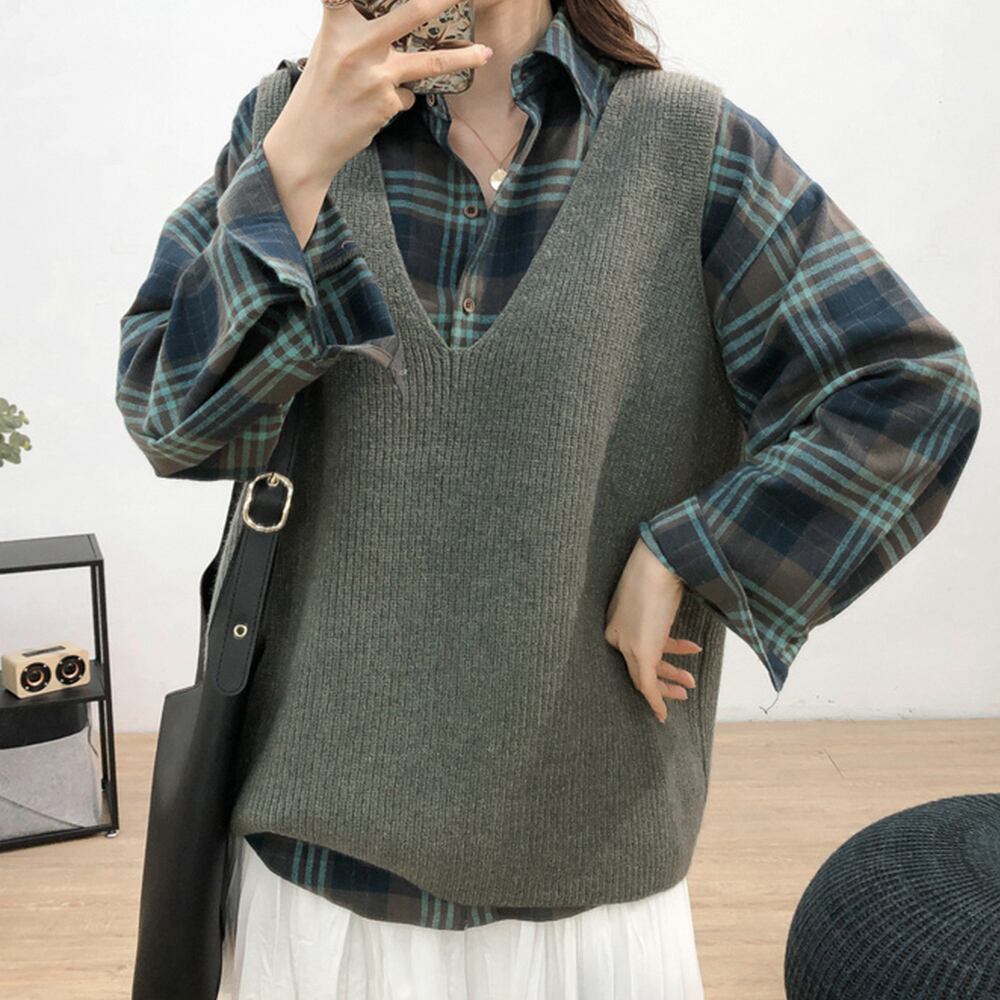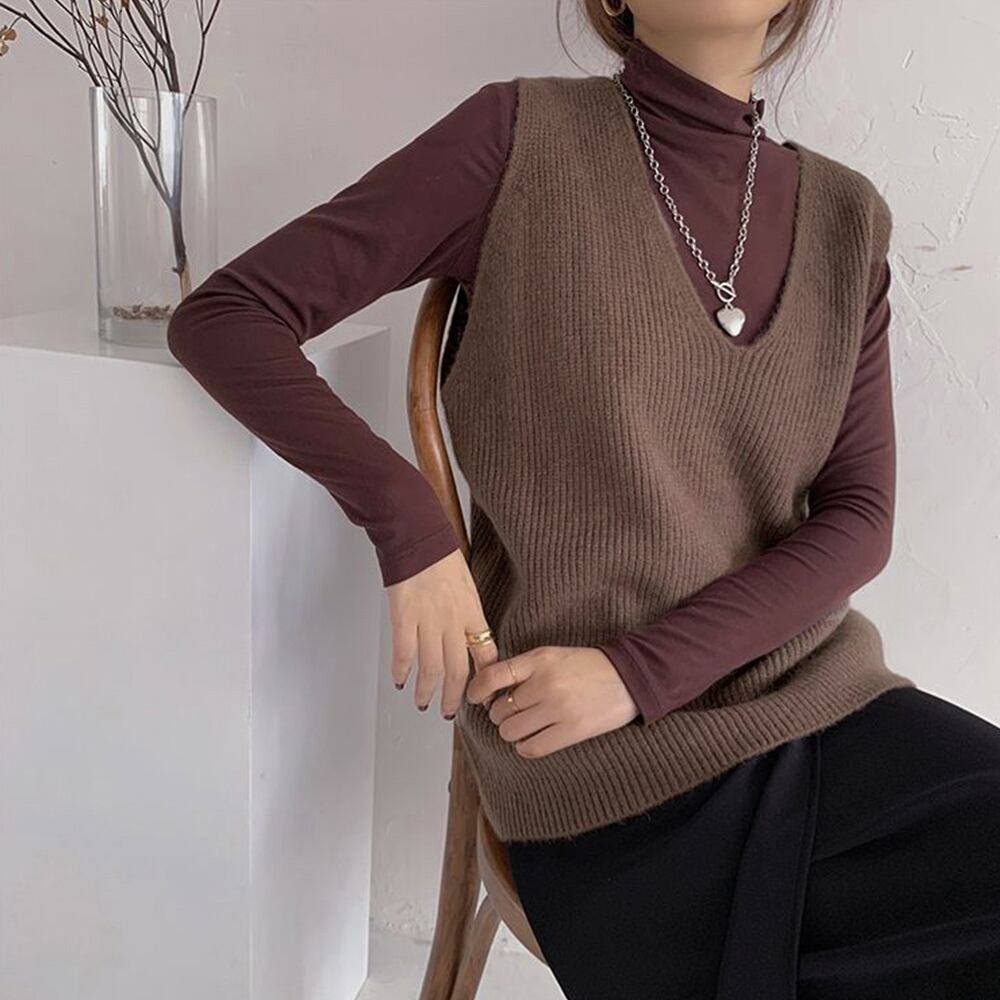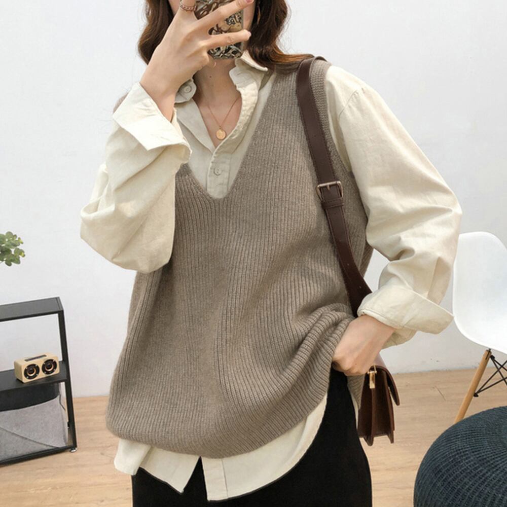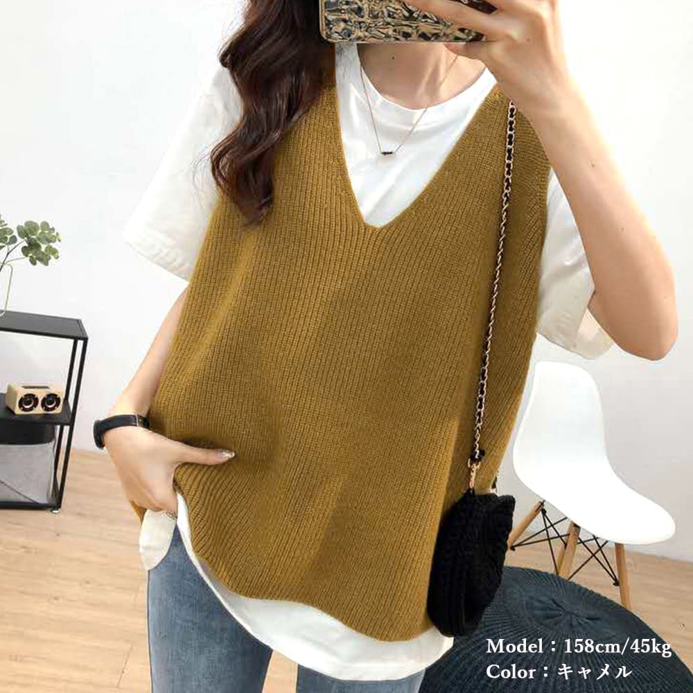 韓国ニットチョッキ ノースリーブ ニットトップス 重ね着風 レイヤードベスト レトロ体型カバー ニットジレ 20代30代