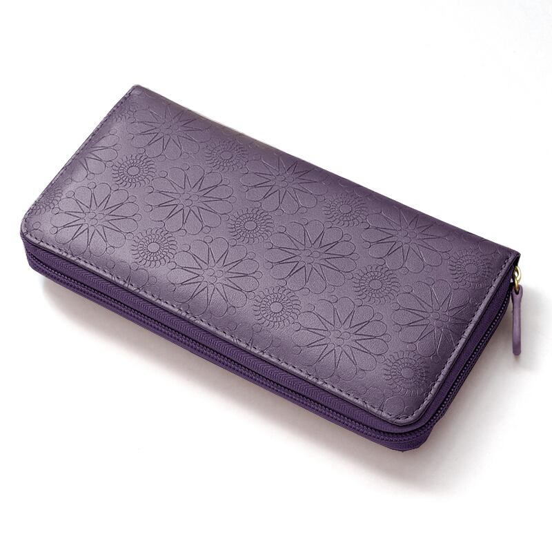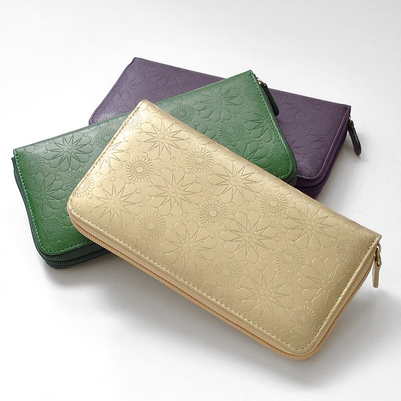 華やかな柄の型押し牛革を使用した背面ポケット付きラウンド長財布。