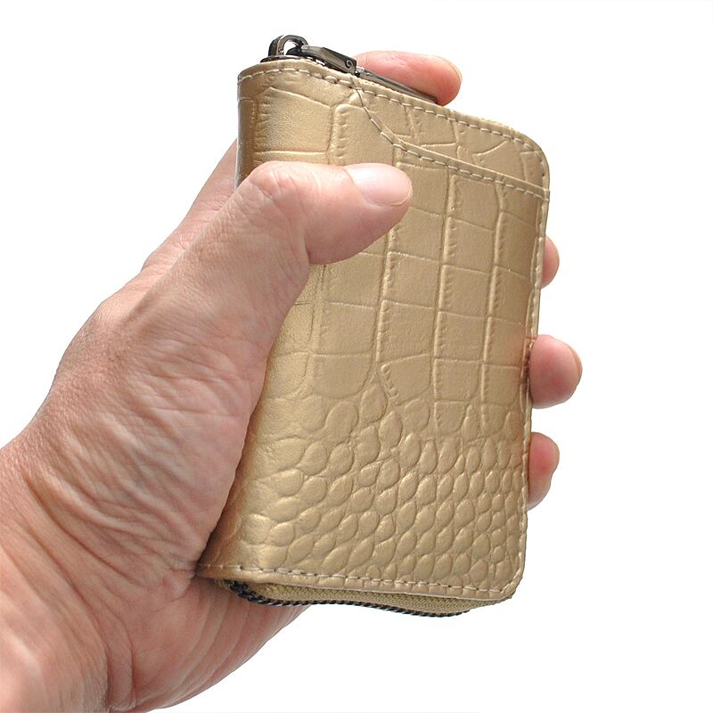 外側にはクロコダイル柄を型押しした、高品質な牛革を使用。