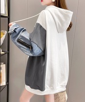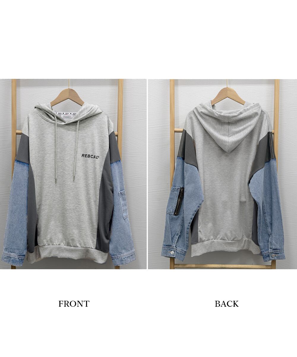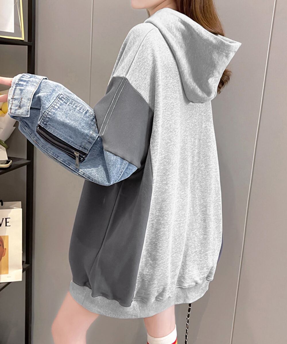 お尻まで隠れてさりげなく体型カバーする異素材mixデニムパーカー