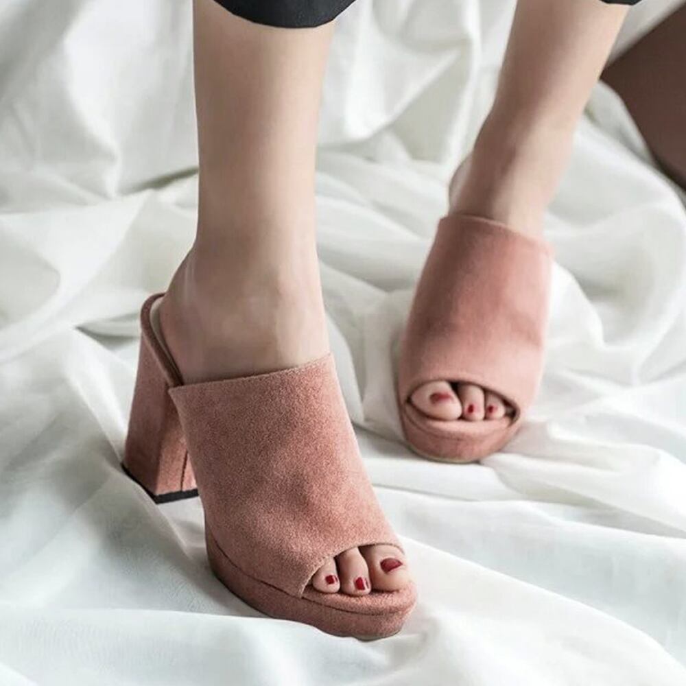 普段使いでもオフィシャルシーンでも使える太ヒールのスエード調サンダル