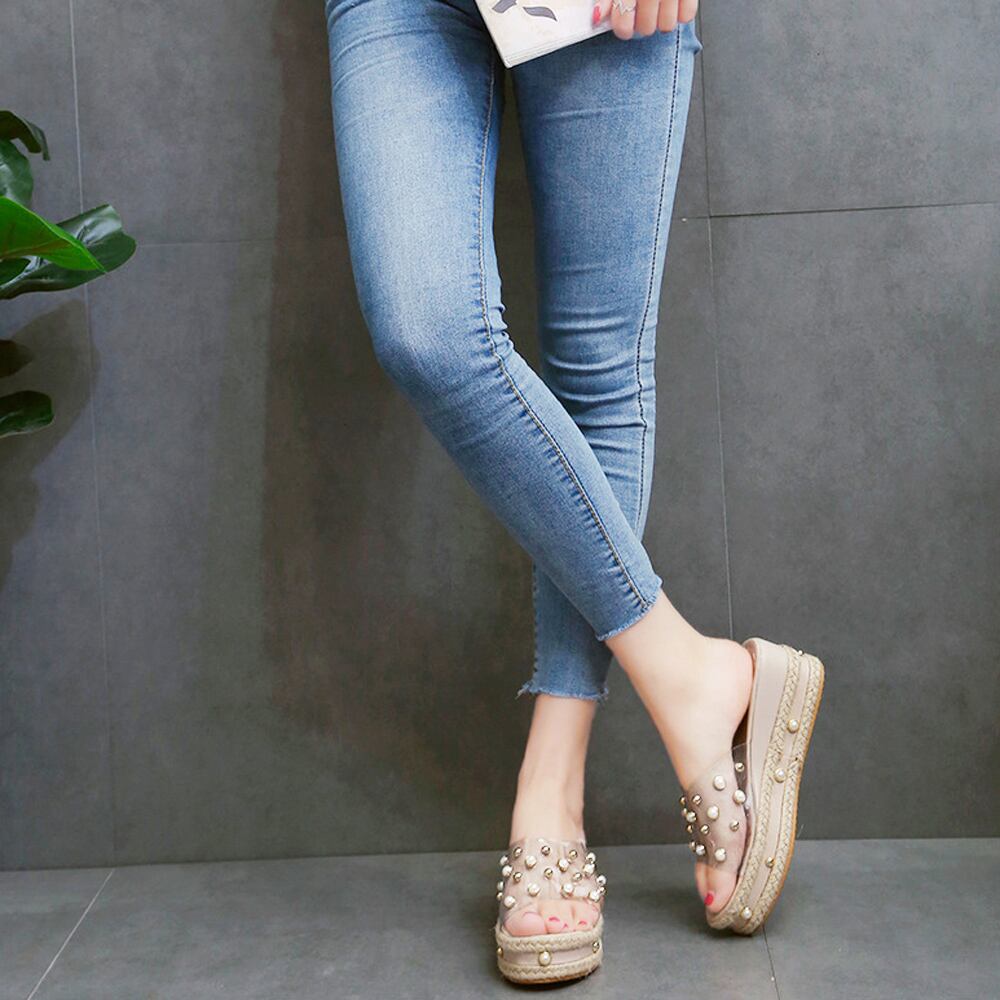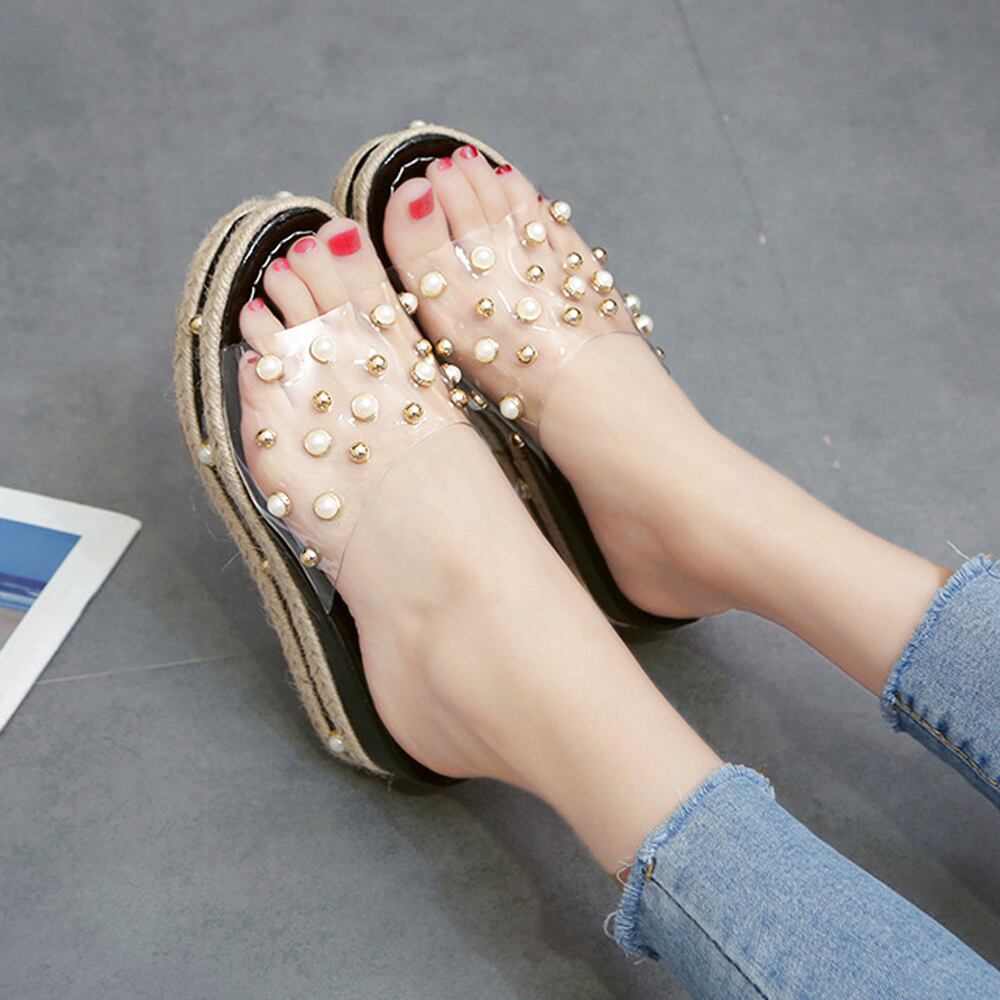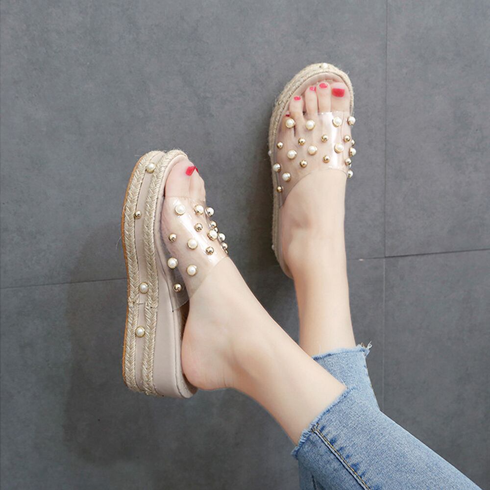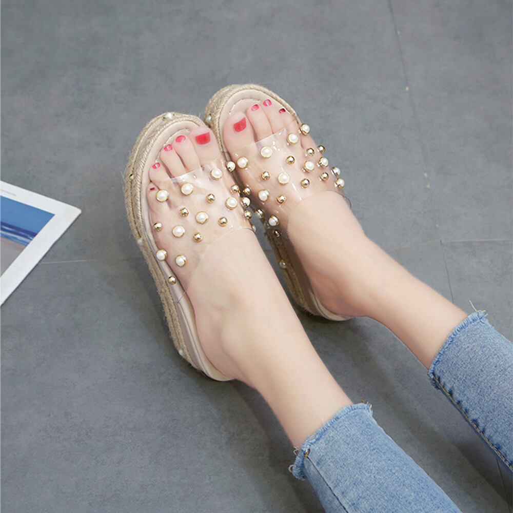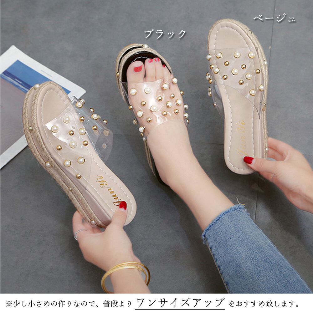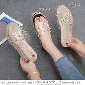 パールスタッズにクリア素材のレディースライクなウェッジヒールサンダル