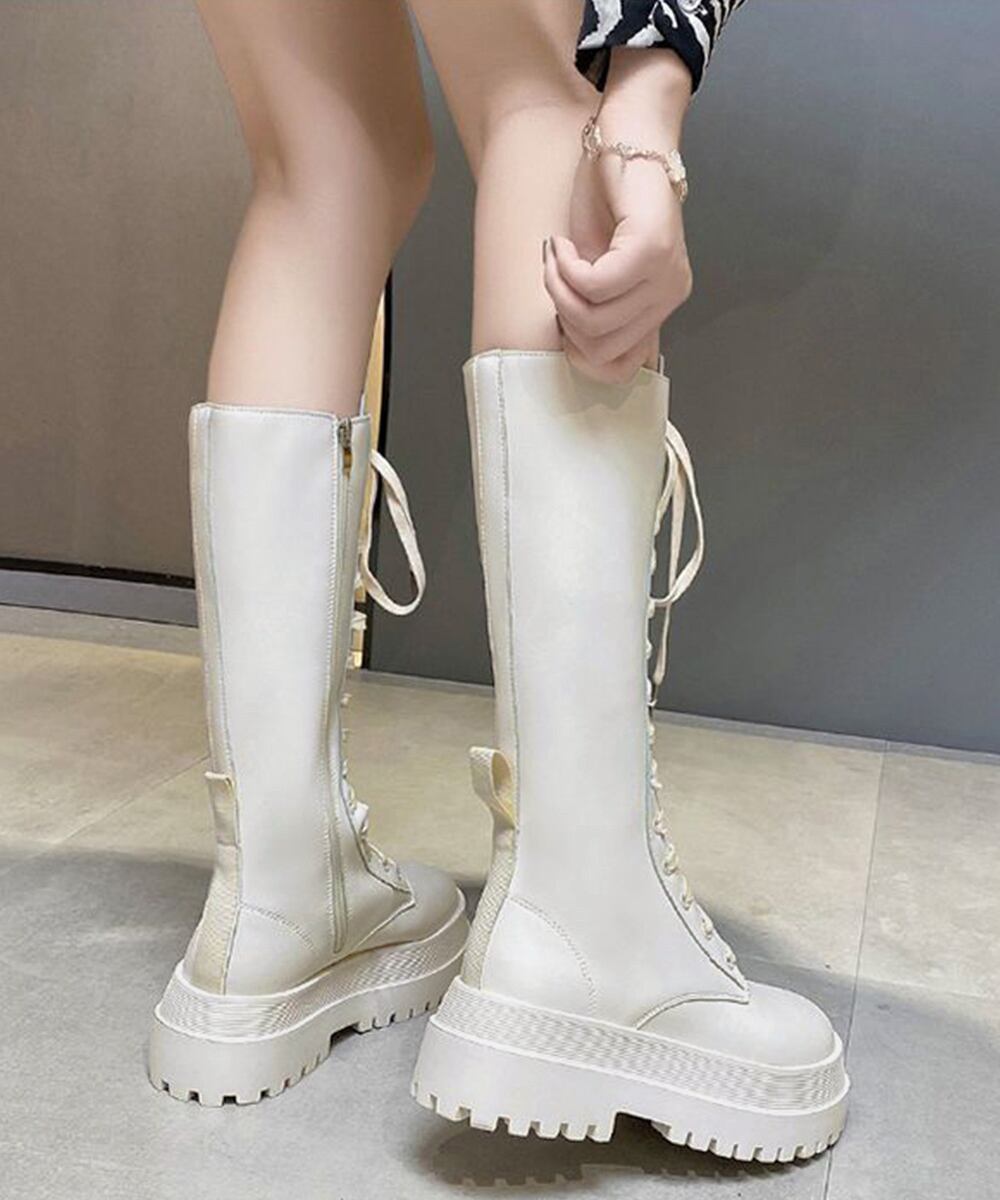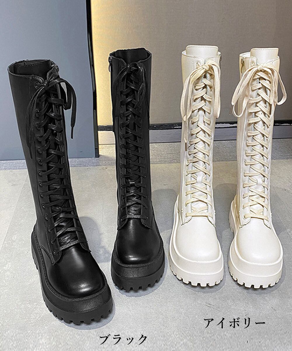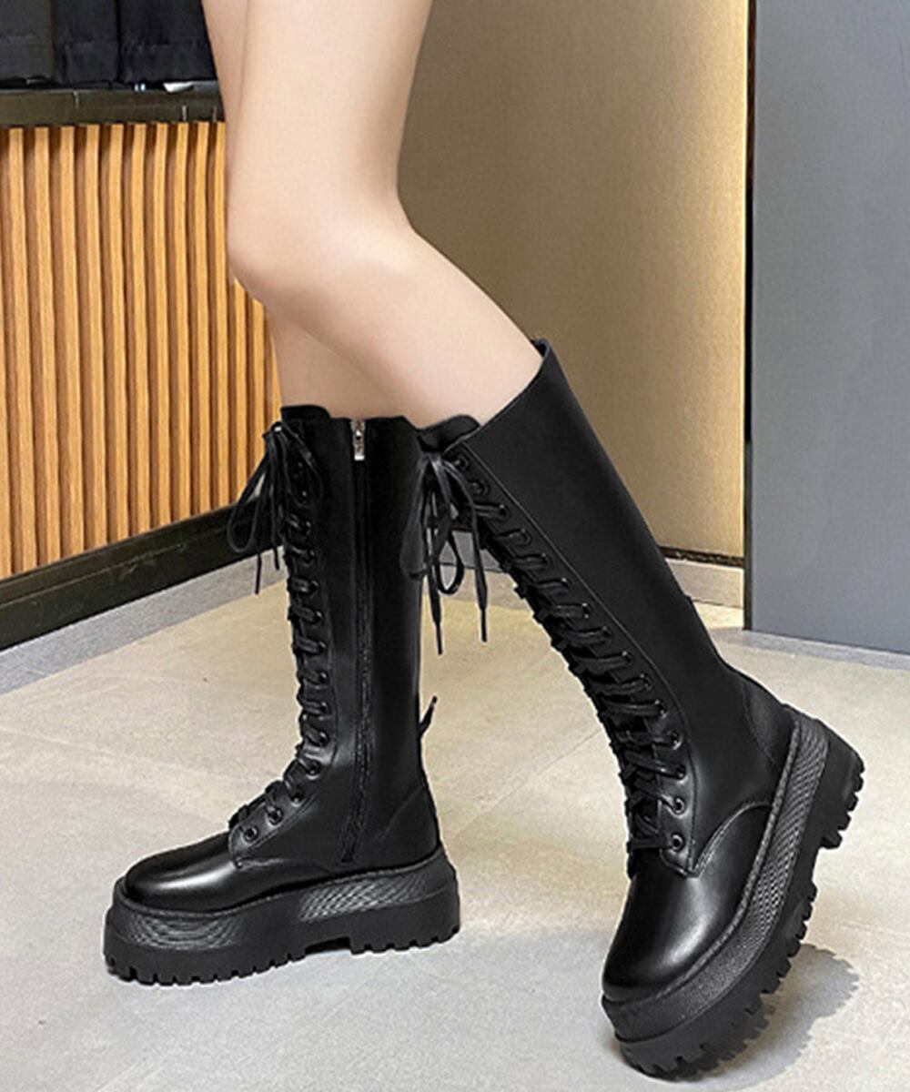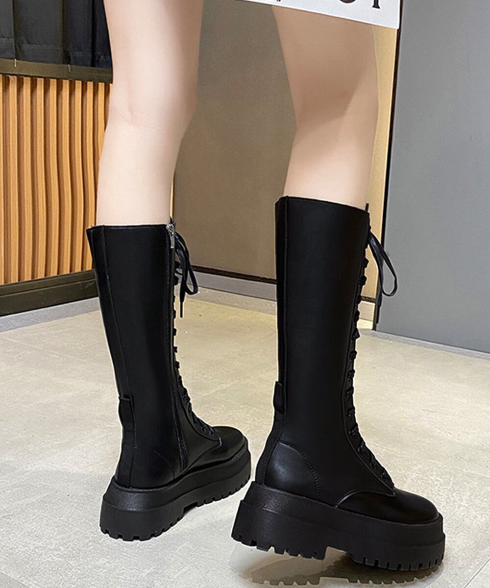 韓国 厚底ロングブーツ 秋冬シューズ 編み上げブーツ ボリューム感 美脚 サイドジップローヒール靴 おしゃれ 疲れにくい