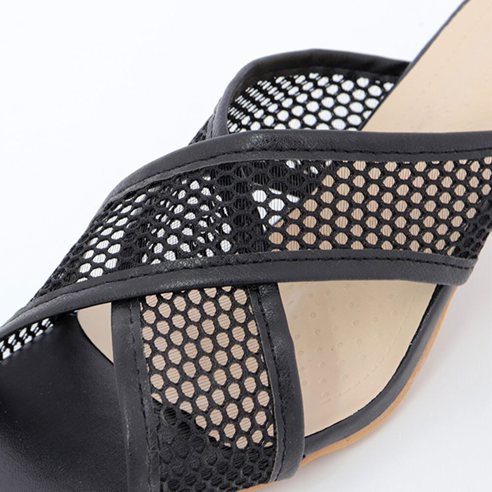スクエアトゥ サマーサンダル 6cmヒール ミュール メッシュ靴 美脚 クロス 大人 シースルー レトロ シューズ