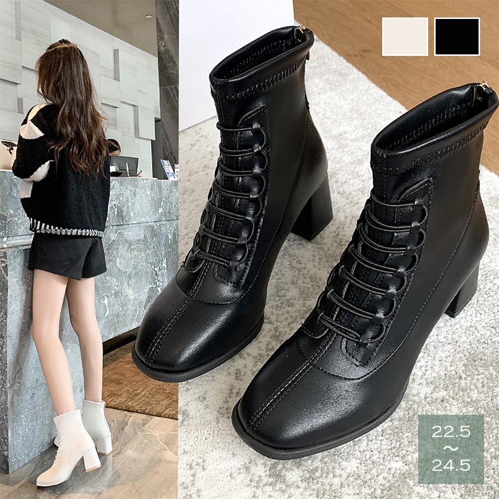 シンプルでベーシックなレースアップ風のスクエアトゥショートブーツ。
