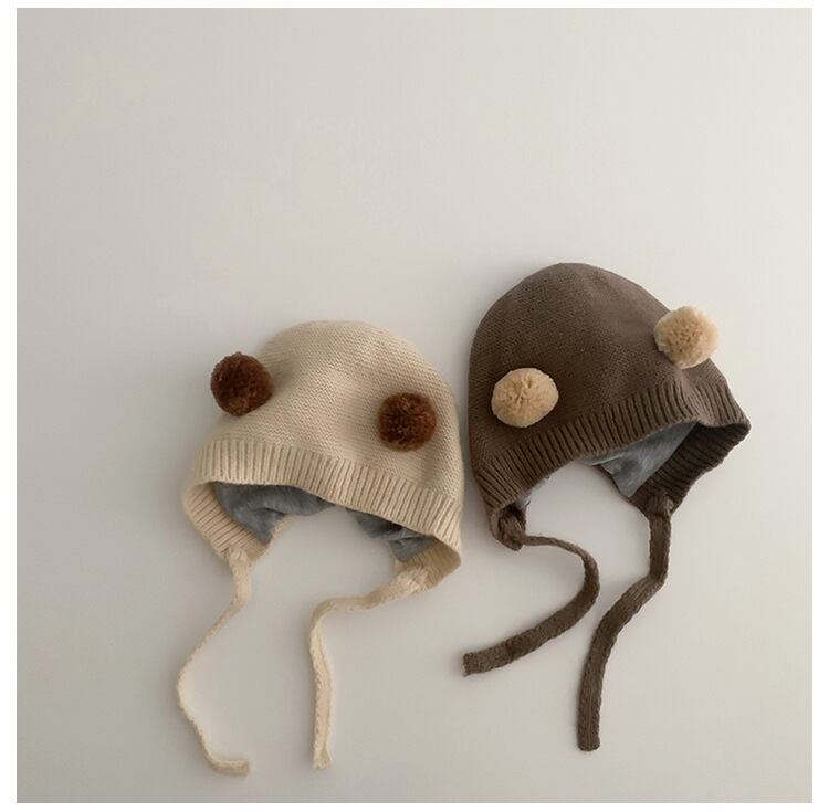 ・上部にミニポンポンが二つ付いた可愛いベビーニット帽。