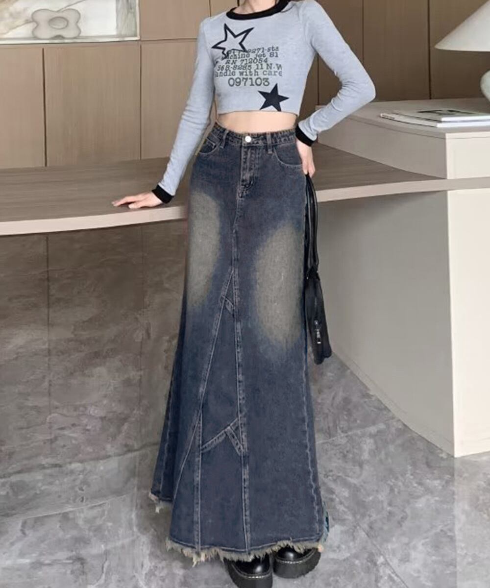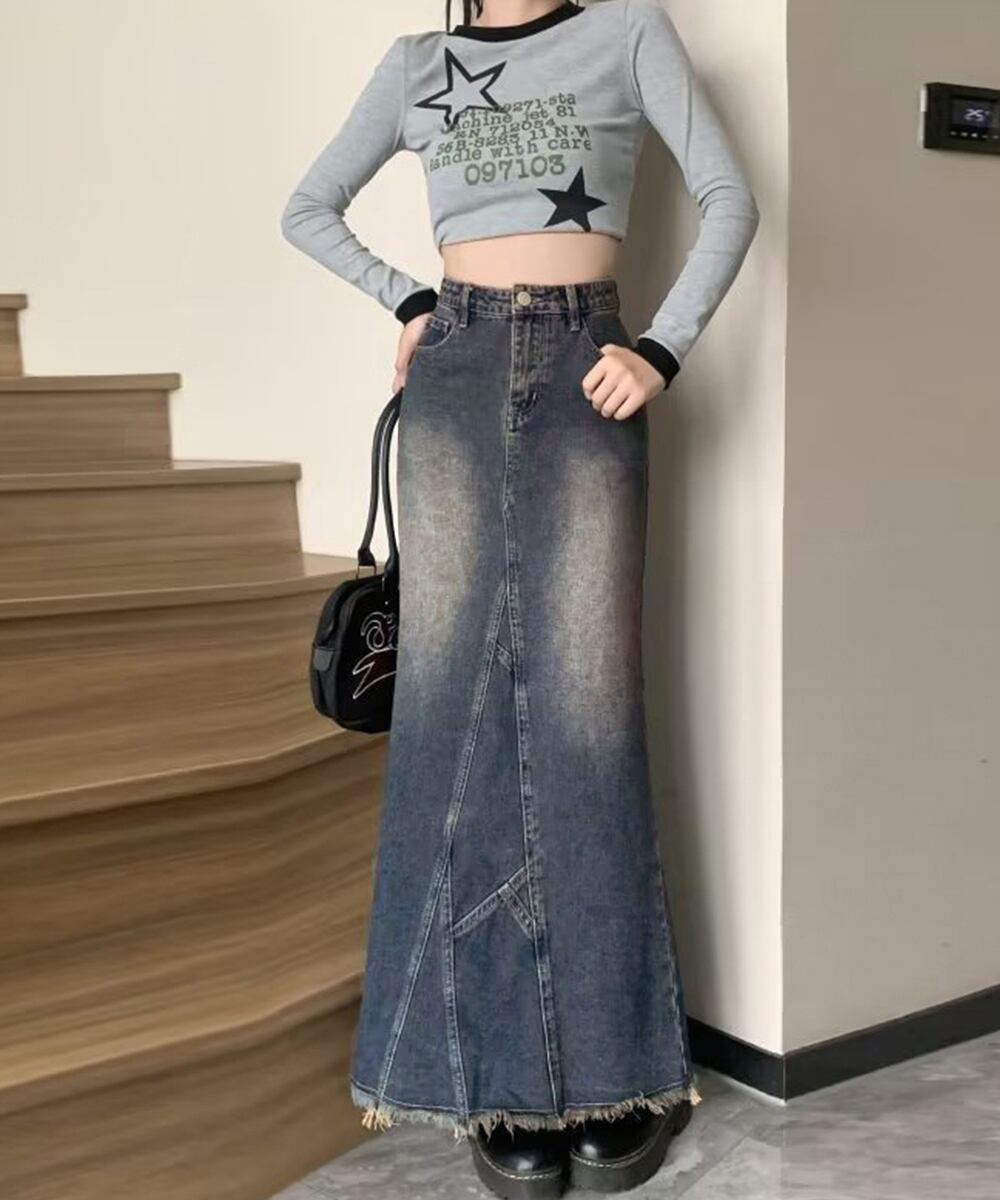 着やせデニムレトロ ローエッジスカート マーメイドスカート