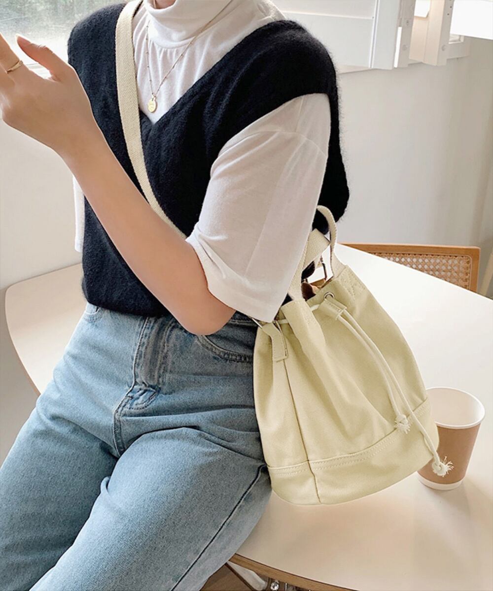 キュートなフォルムが可愛い、こなれ感のあるカジュアルなバケツ型ショルダーバッグ
