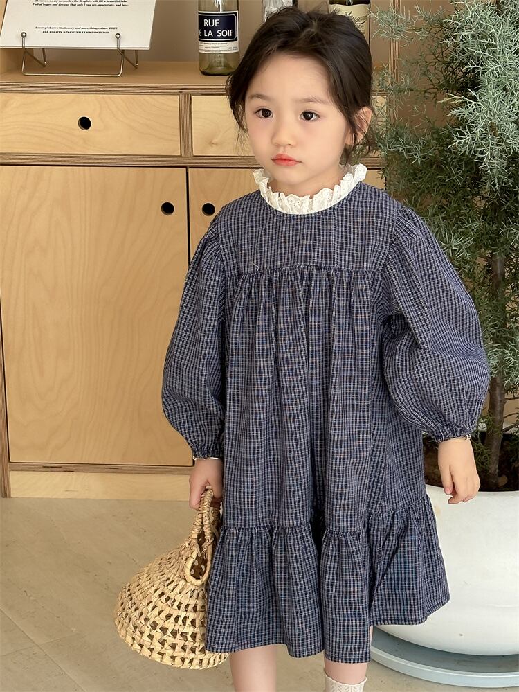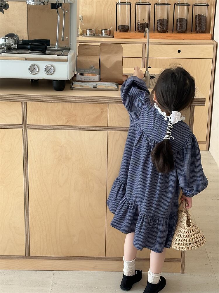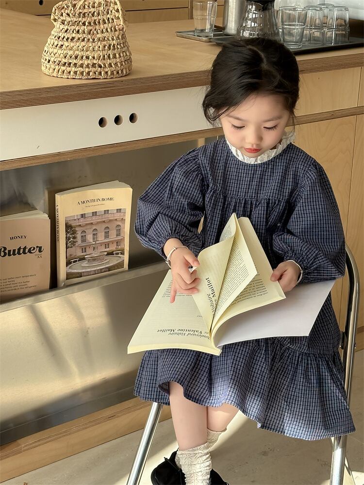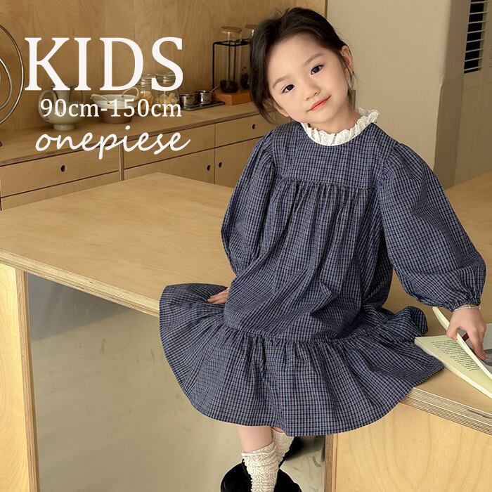 【海外からの取り寄せ】2024新作 韓国子供服 子供 キッズ ワンピースチェック柄 ネイビー フリルネック 長袖 #[kids704_16800]【送料込み】【250706】