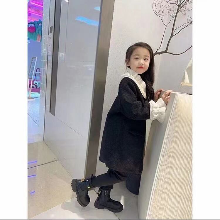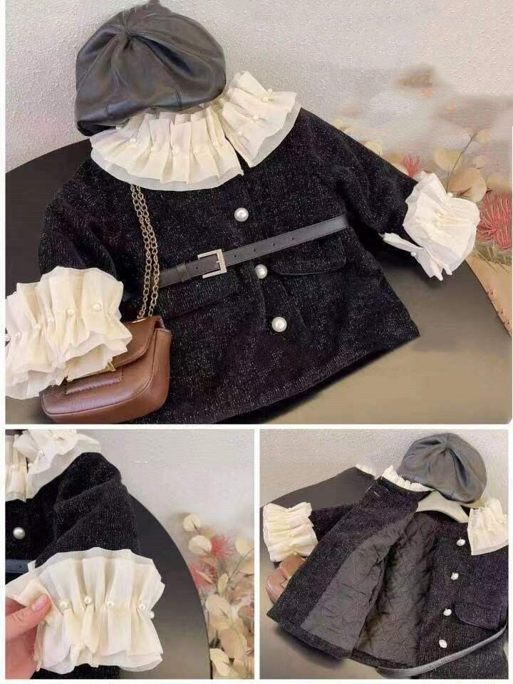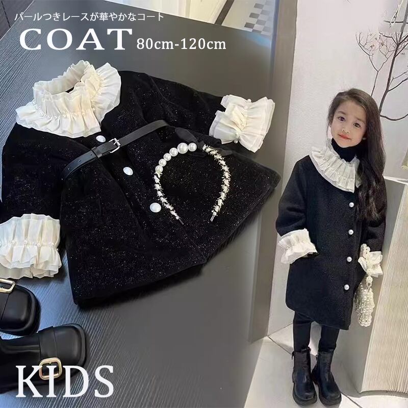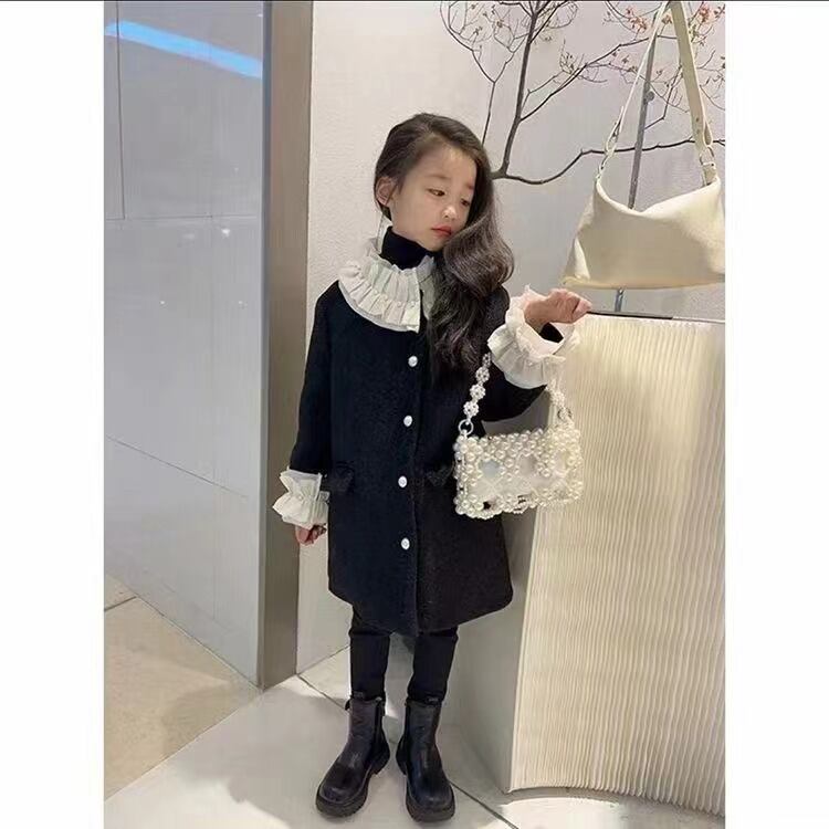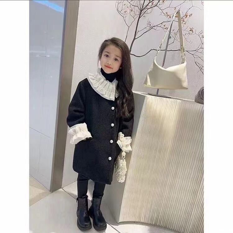 【海外からの取り寄せ】2023秋冬新作 韓国風 子供服 女の子 可愛い キッズ コート ボタン 大きい襟 黒 アウター レース パール #[kids681_27800]【送料込み】【250923】