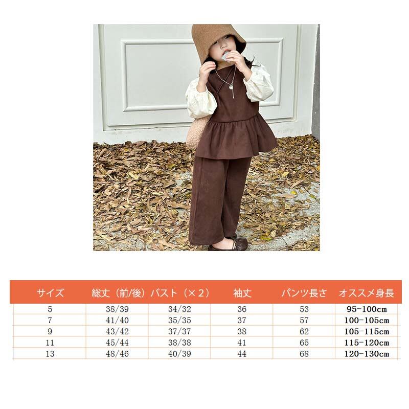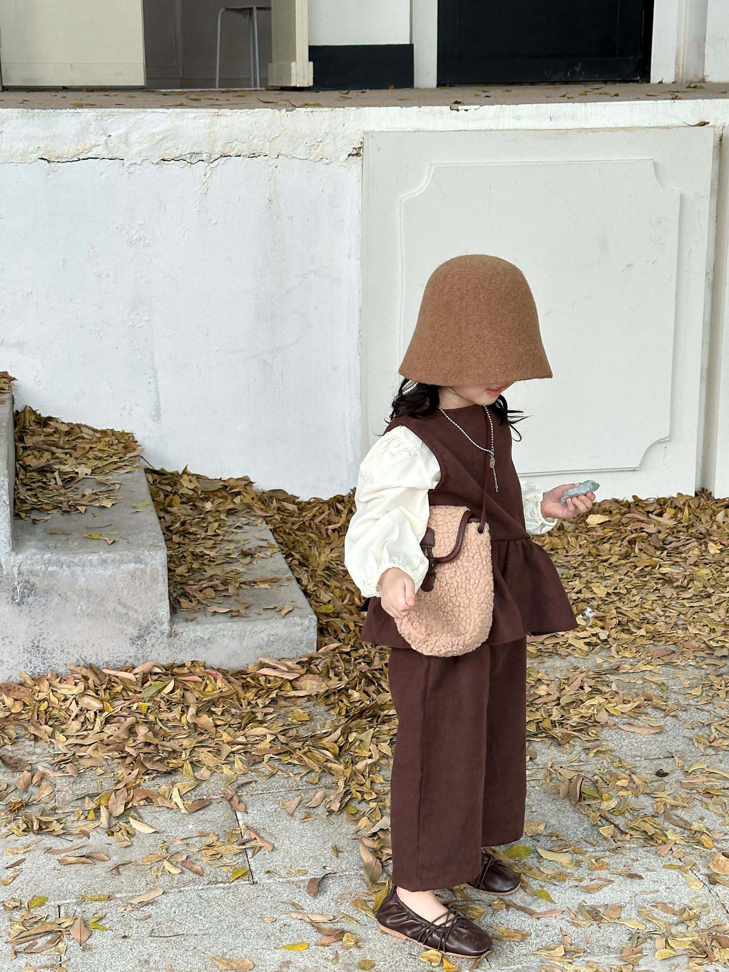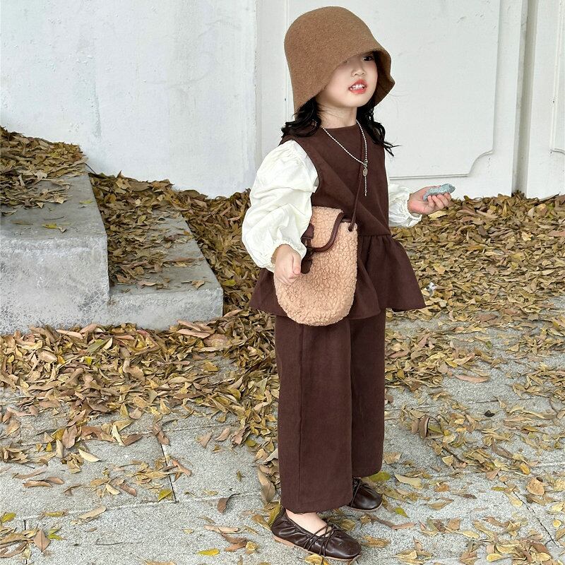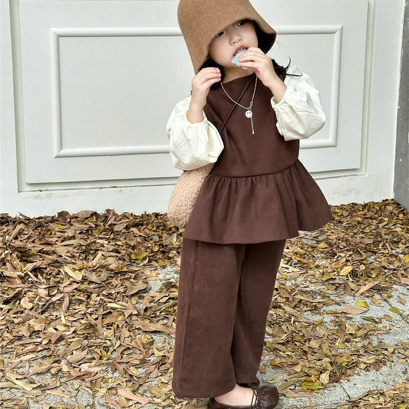 【海外からの取り寄せ】2024新作 韓国子供服 3セット販売キッズ ブラウン ワイドパンツ ボリューム袖 トップス フリルベスト 茶色 #[kids689_18800]【送料込み】【250706】