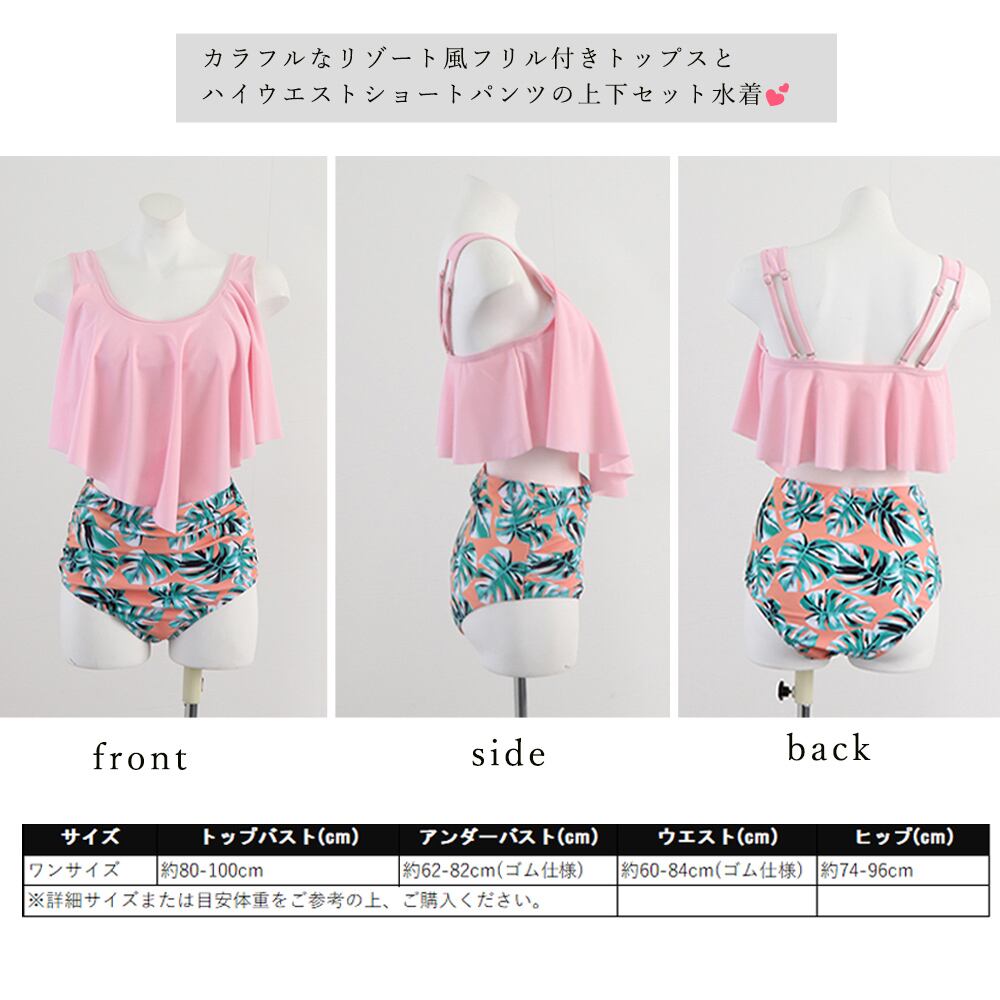 カラフルなリゾート風フリル付きトップスとハイウエストショートパンツの上下セット水着