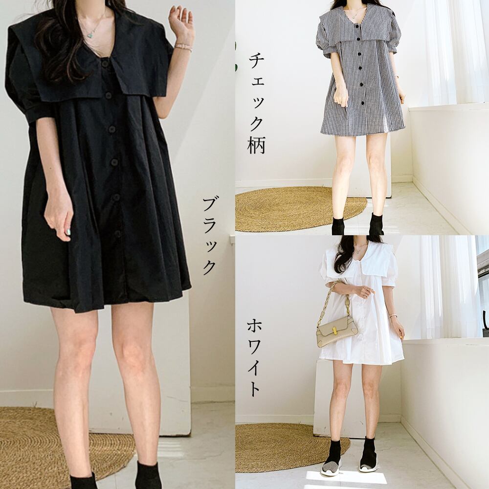 ワンピース 韓国風 ゆったり オーバーサイズ レディース 半袖 体型カバー BIG襟 チェック柄 ボリューム袖 大人上品