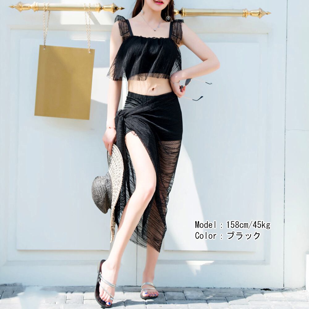 露出少なめでオシャレな巻きスカート付きのレディース水着3点セット
