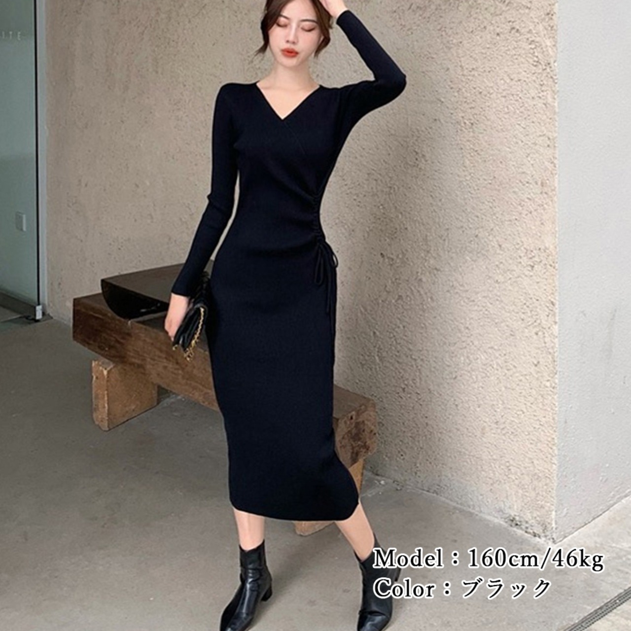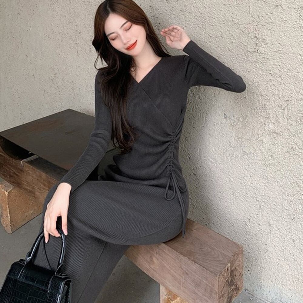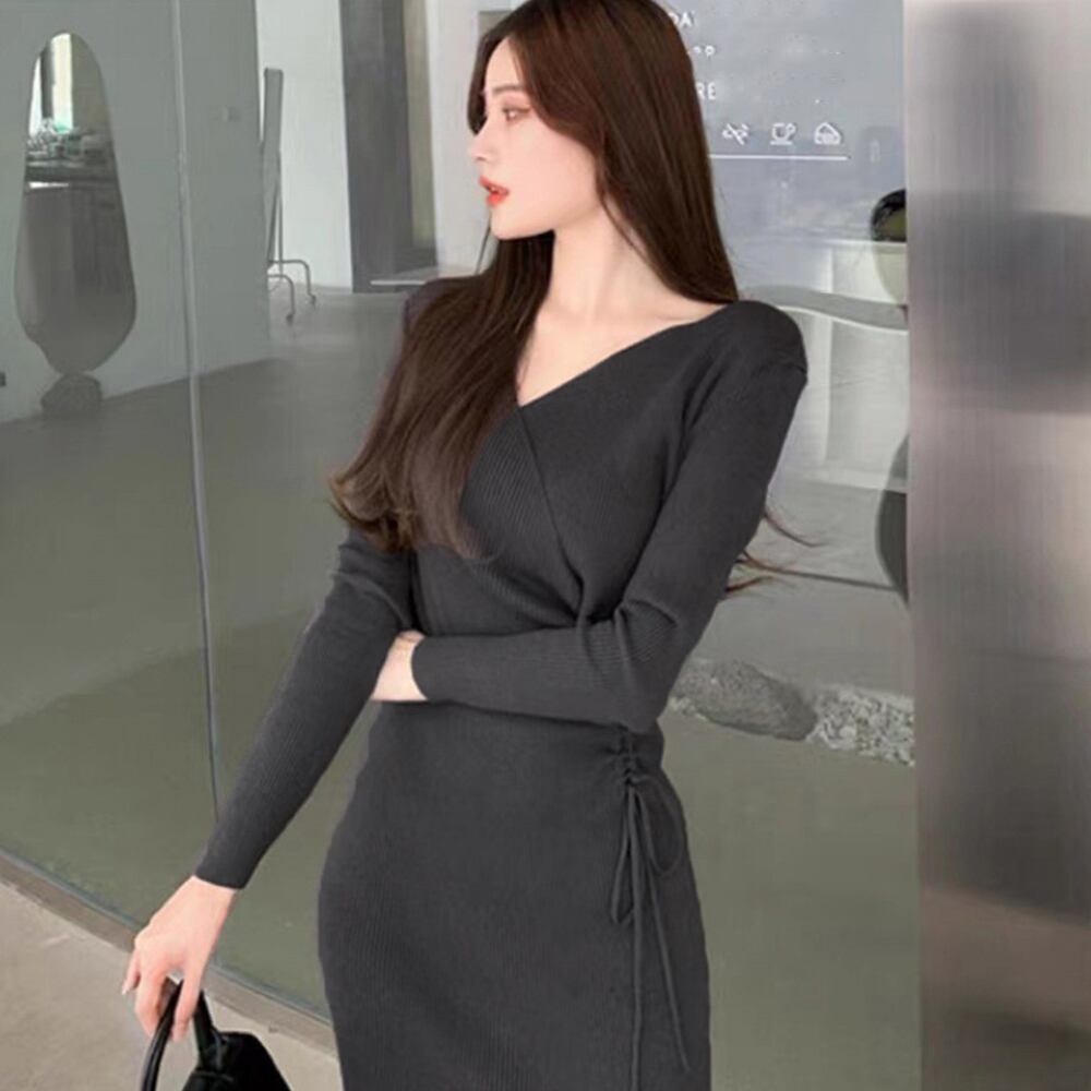 サイドレースアップ タイトワンピース 大人カジュアル 韓国風 ロングワンピース きれいめ ミモレ丈ワンピース 暖かい