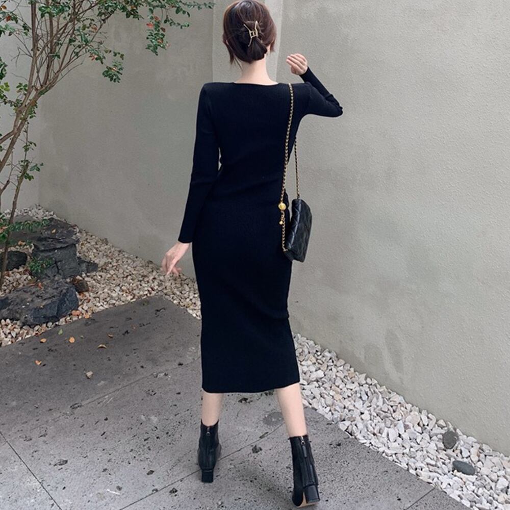 体にぴったりフィットして、ボディラインを魅せるリブニット素材のタイトワンピースです