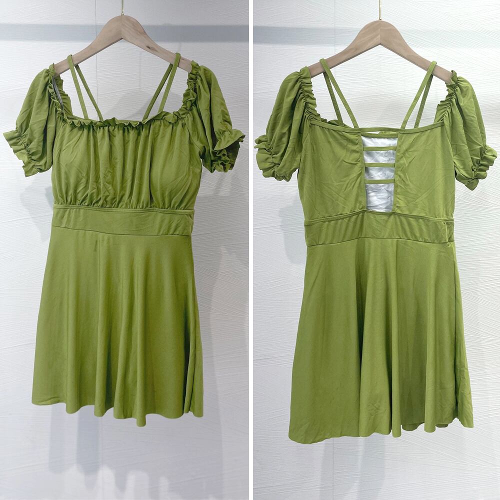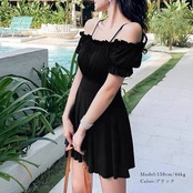 縦フリル付きで女性らしいオフショルダーワンピース水着