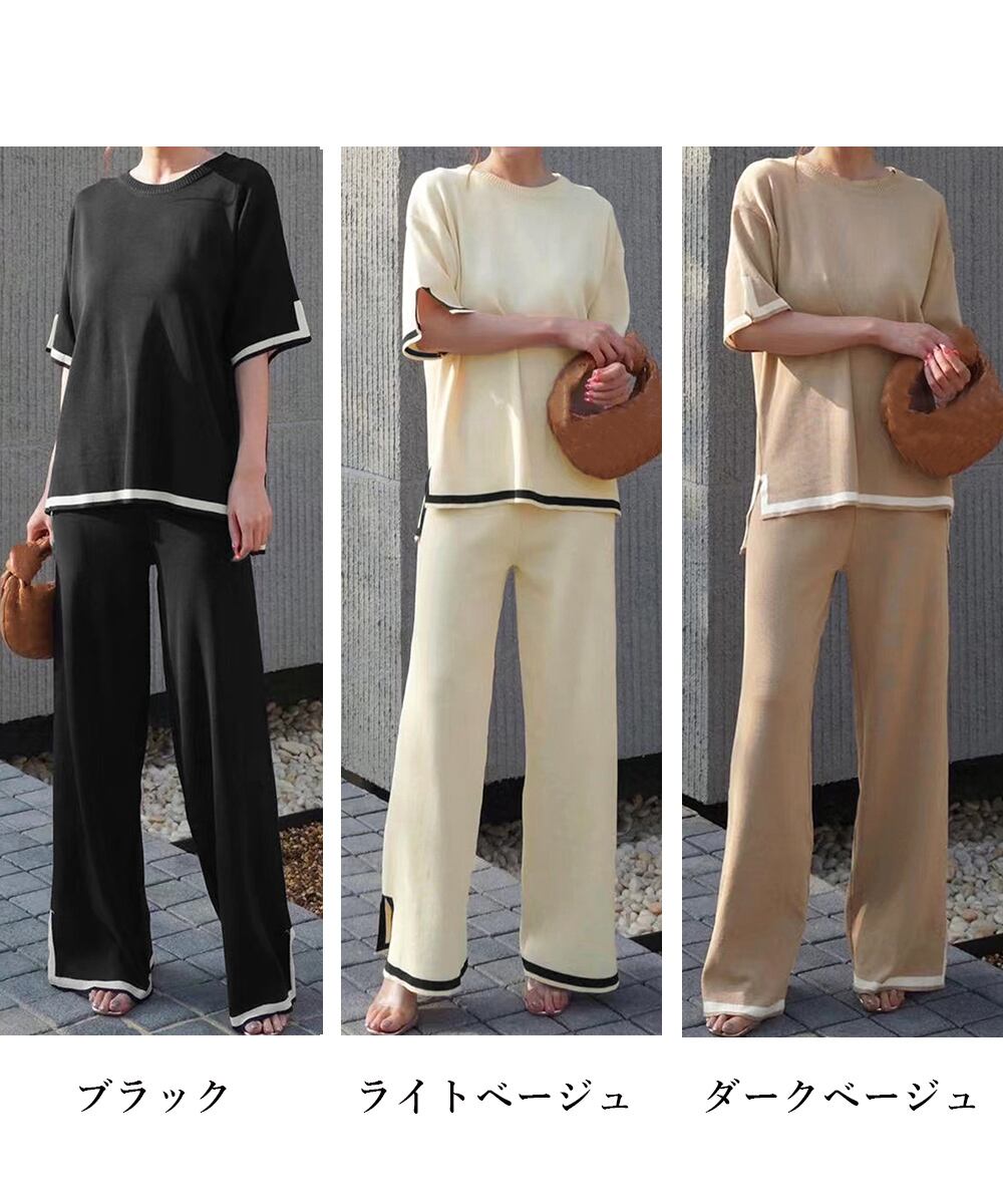 ラウンドネックニット ウエストゴムワイドパンツ オフィスカジュアル服セットアップ 体型カバー半袖2点セット 30代40代