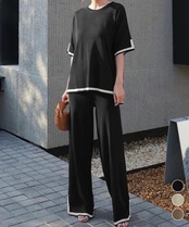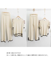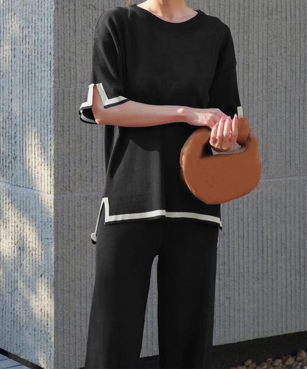 縁に配色のラインを施しているのがアクセントになっているニットセットアップ