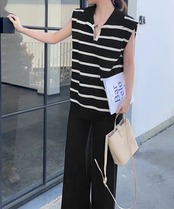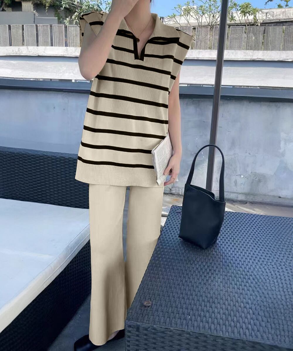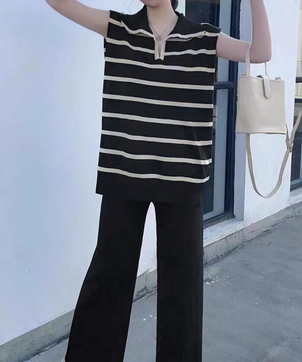 ボーダ柄ポロカラーサマーニットxハイウエストワイドレッグパンツのセットアップ