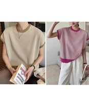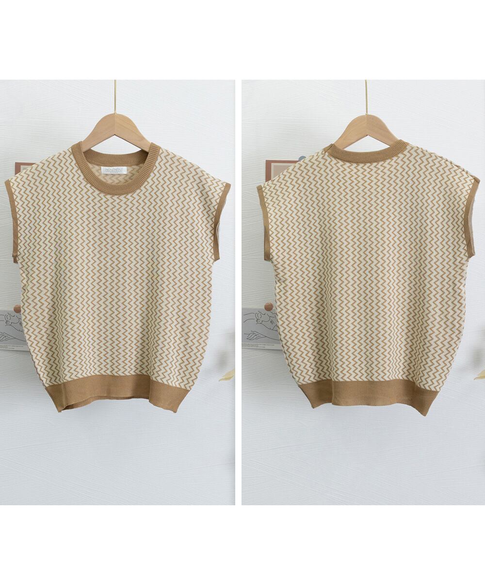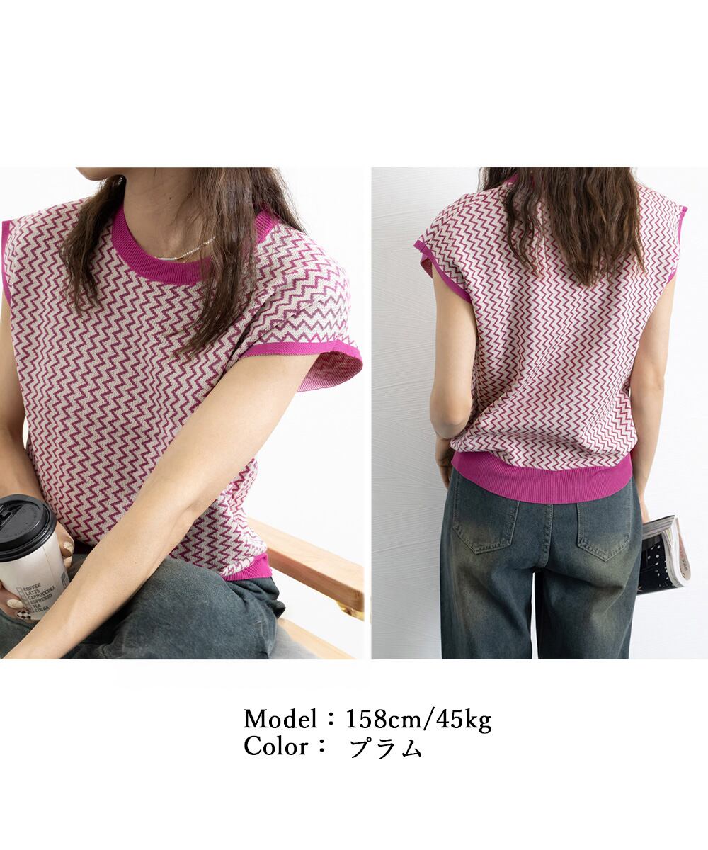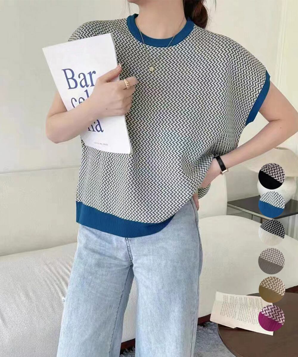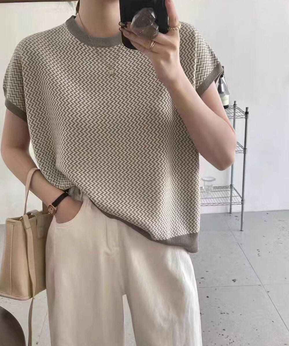 ノースリーブニットトップス きれいめ 柄ニットTシャツ ゆったり 体型カバー 半袖春夏トップス 丸首 薄手ニットソー韓国