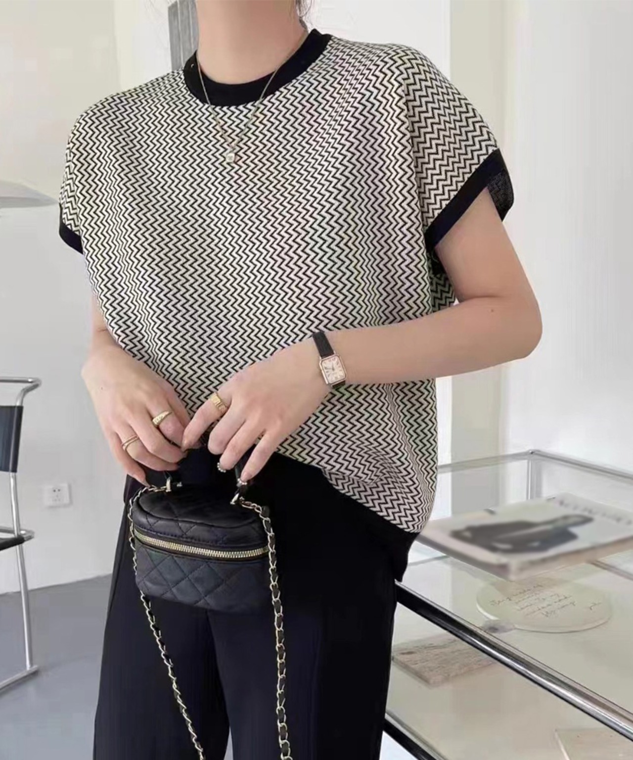 首元の詰まったクルーネックは、露出度が控えめで上品な大人女子を演出