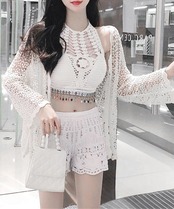 ホルターネックビスチェ タッセルニット 日焼け防止カーディガン ハイウエスショーツ エスニック風 セクシーセパレート水着