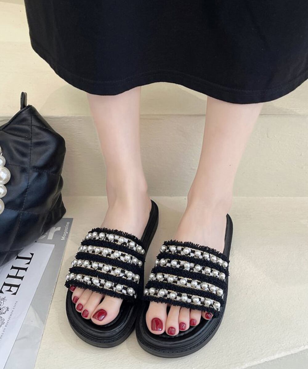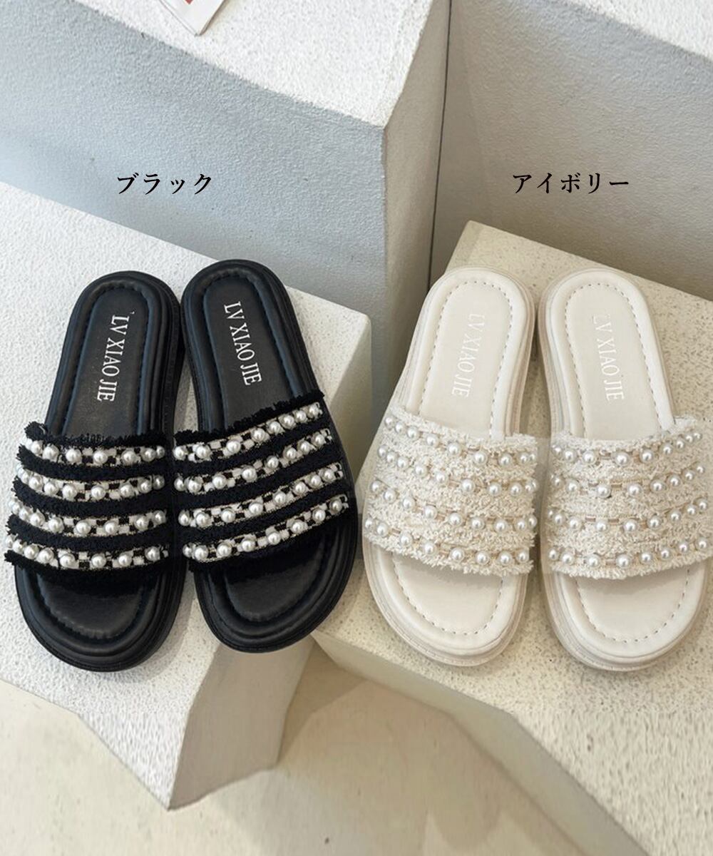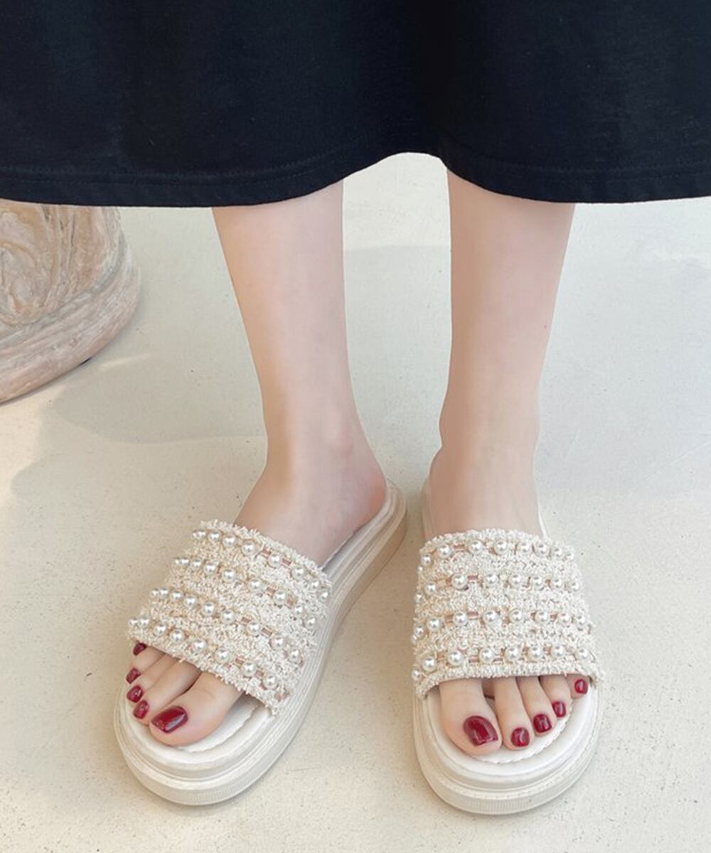 フェイクパールが散りばめられたフェミニンテイストの厚底サンダル