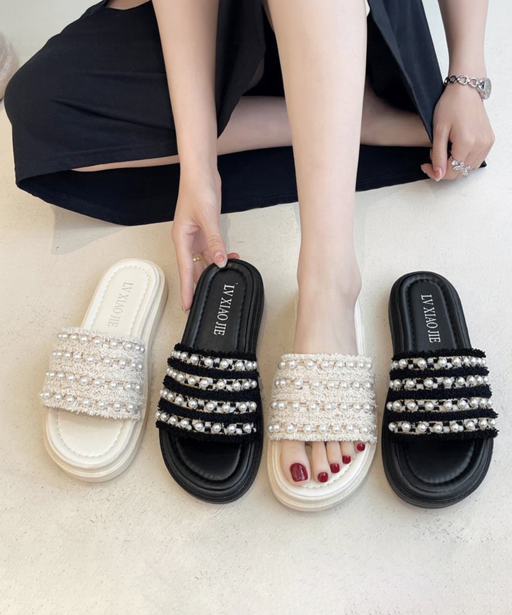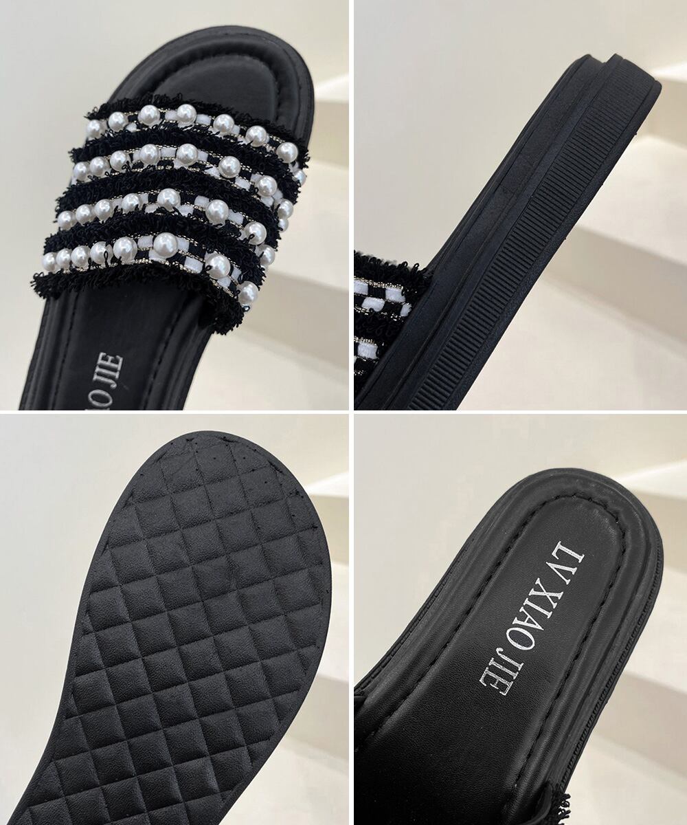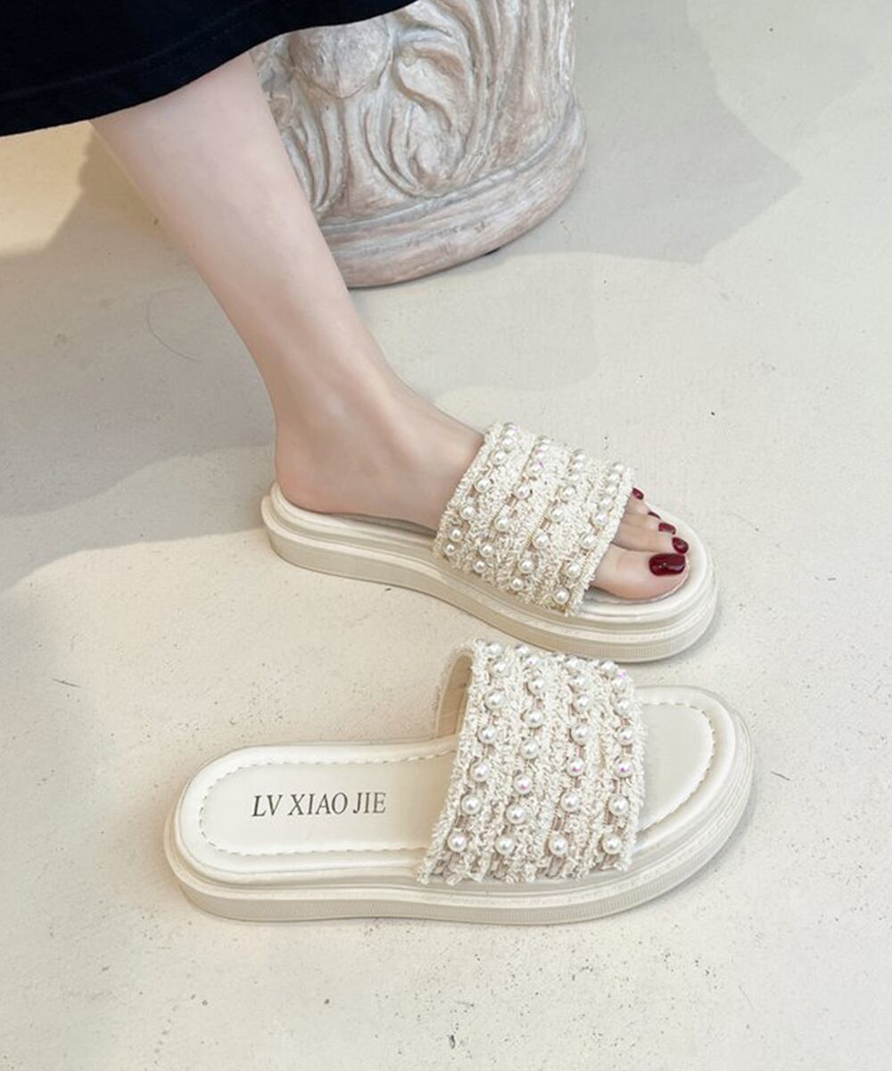 フェイクパールが散りばめられたフェミニンテイストの厚底サンダル
