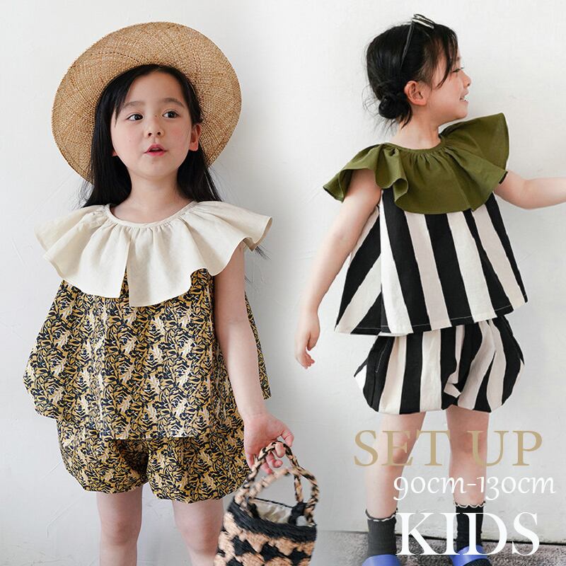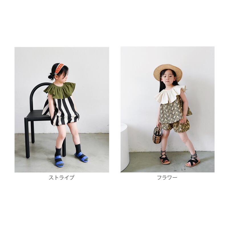 【海外からの取り寄せ】2024新作 韓国子供服 子供 キッズ ノースリーブ ビッグカラー ストライプ 花柄 ショートパンツ フリル #[kids740_15800]【送料込み】【250501】