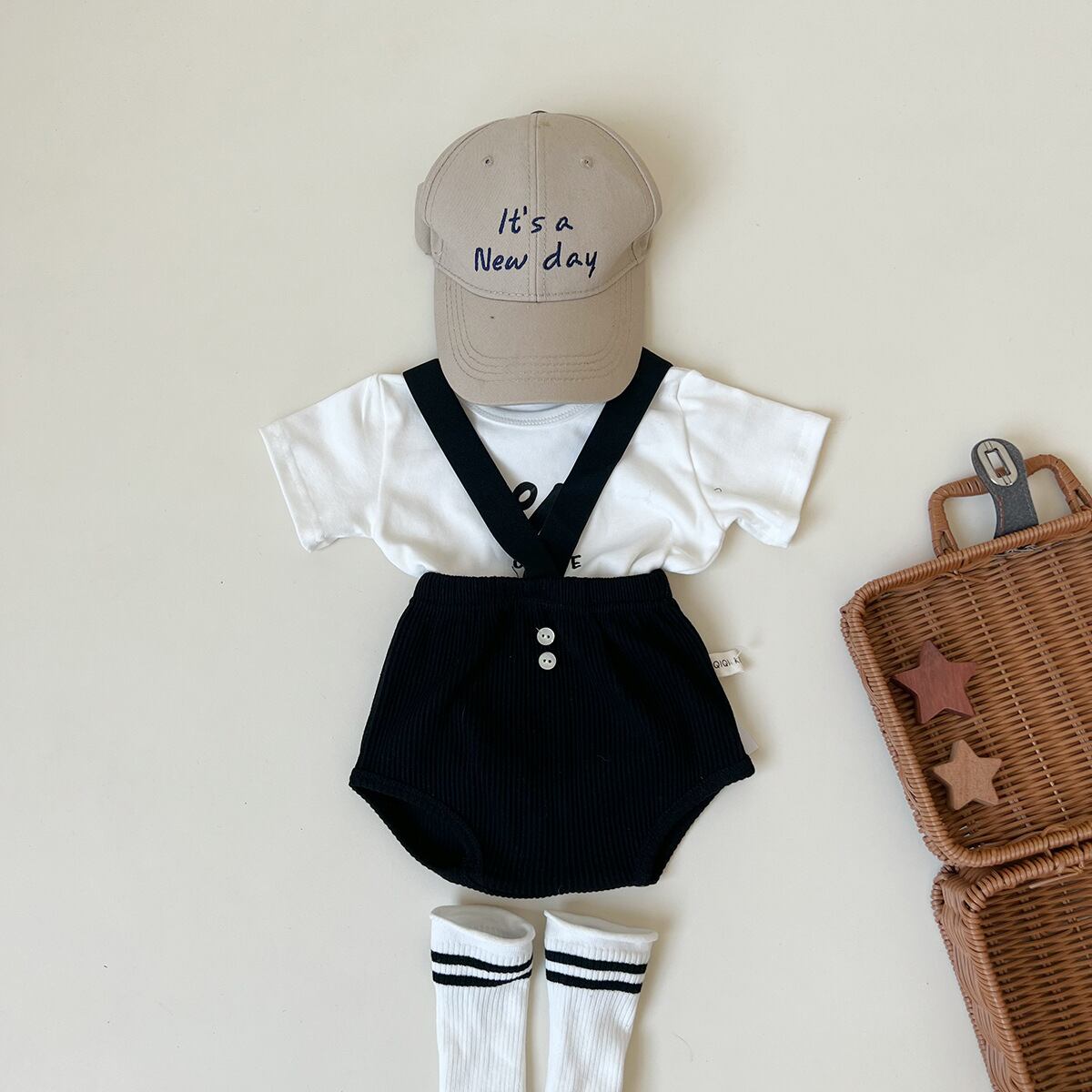 カラー:ブラックサロペット ホワイトTシャツ ストライプTシャツ 靴下