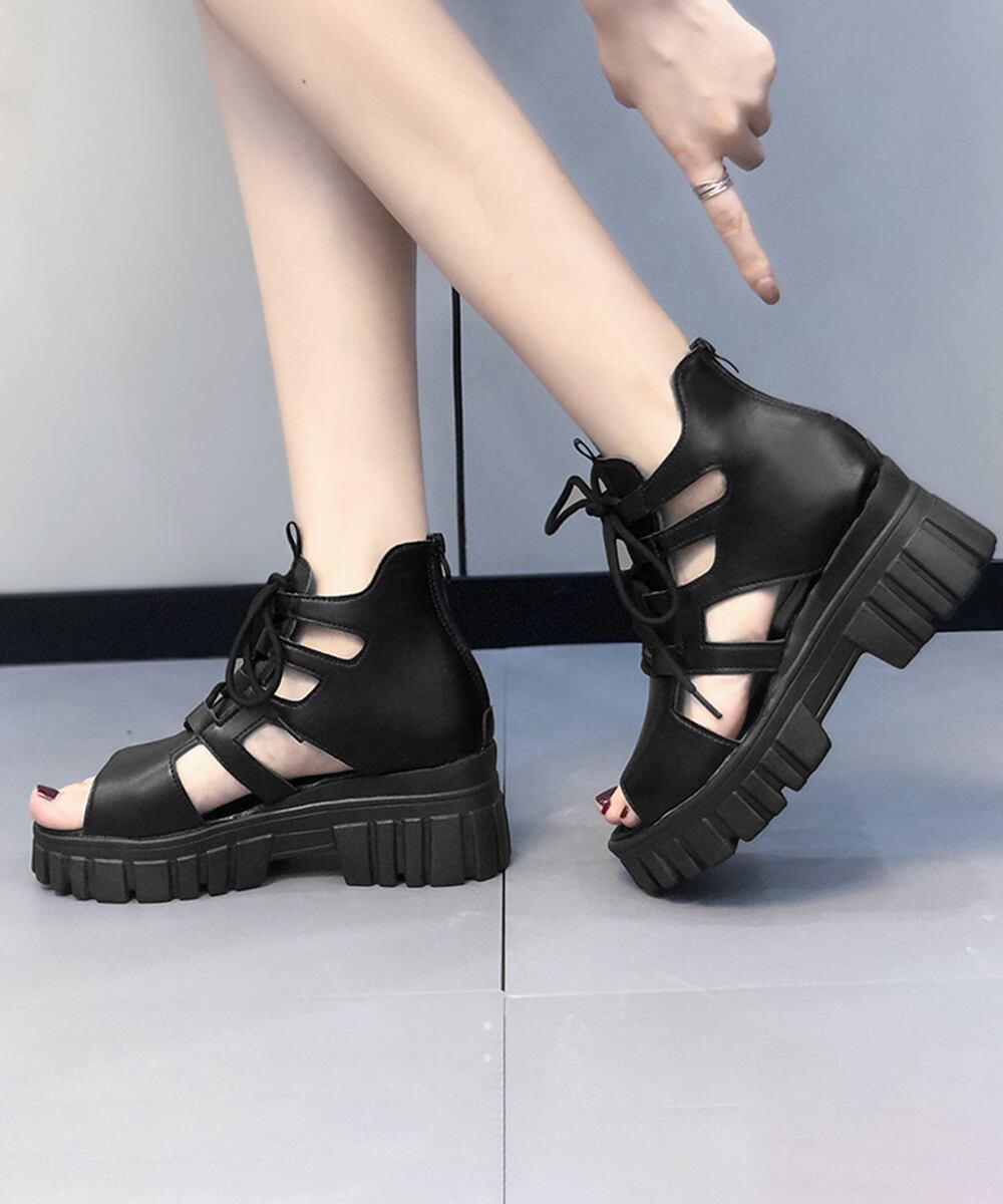 歩きやすい厚底サンダル 美脚脚長 レースアップシューズ サマーブーツサンダル ハイカットサンダル編み上げ 痛くない 韓国