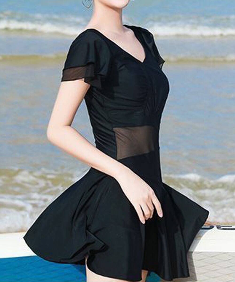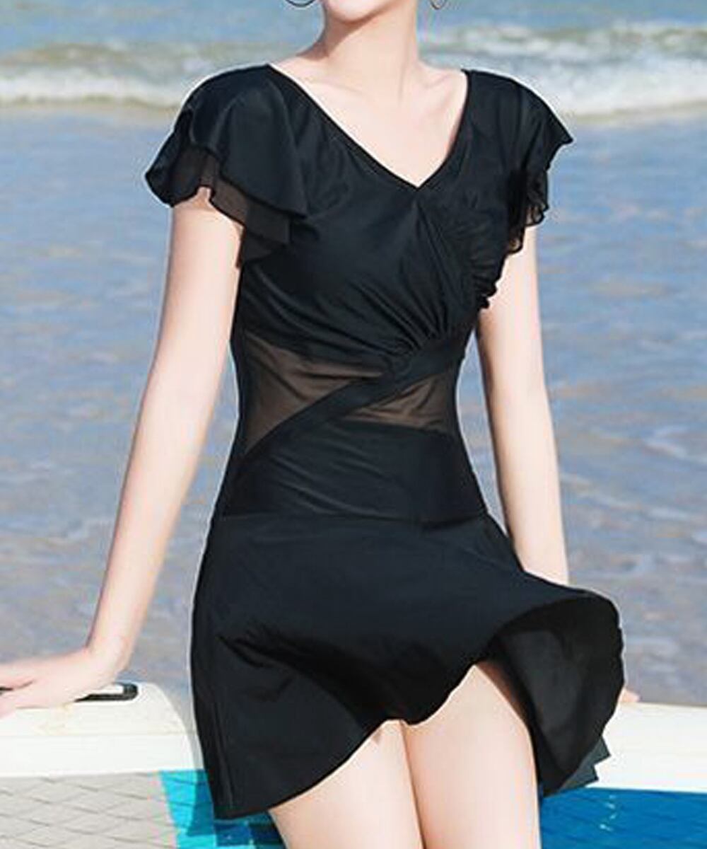 Vネック オールインワン水着 フリル袖 スイムウェア 透かし セクシーママ水着 ショートパンツ一体型 大人可愛い 無地