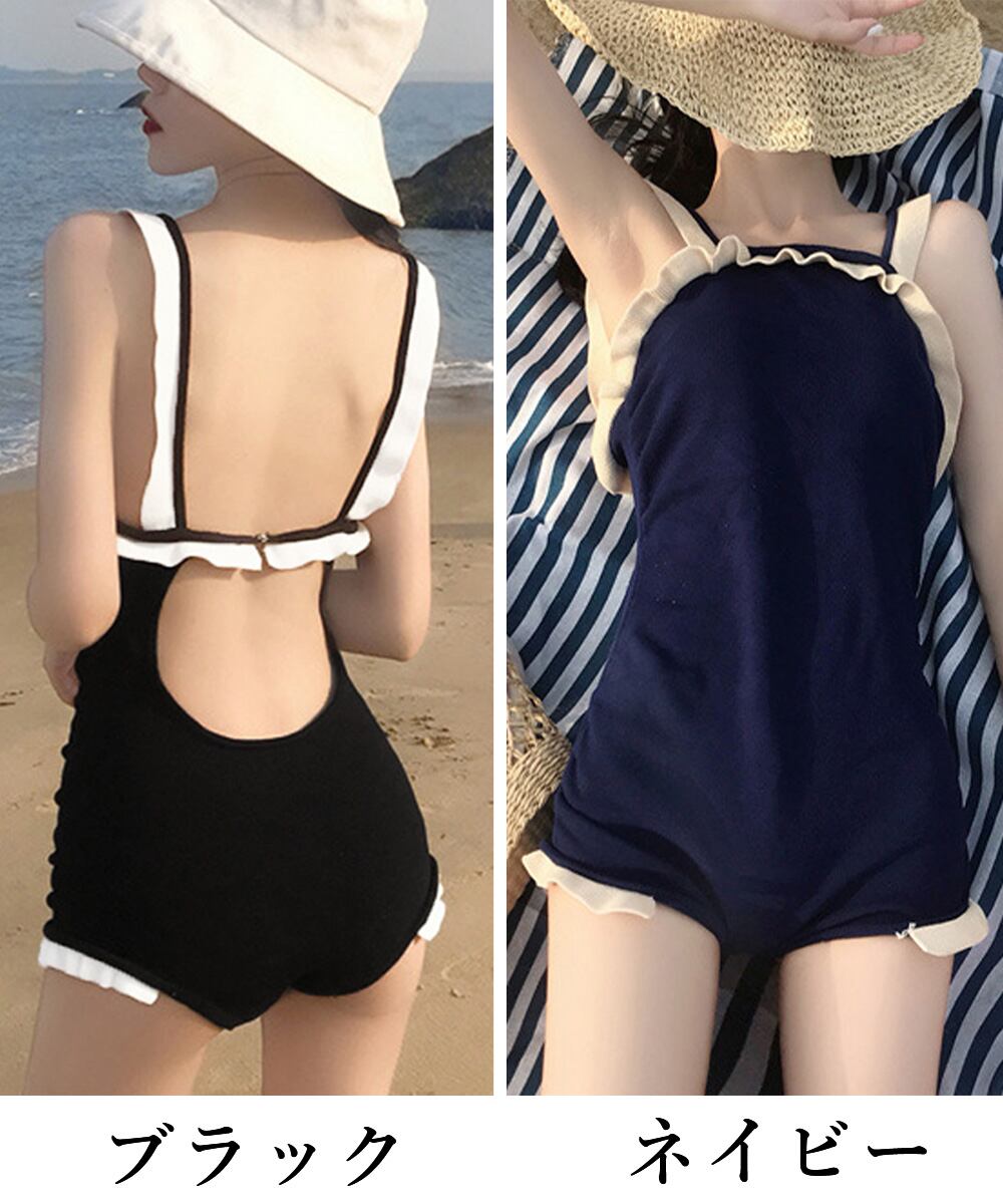 パイピングフリル水着 背中見せ リゾート オトナ女子 セクシー オールインワン水着 海水浴 可愛い 夏海 スイムウェア