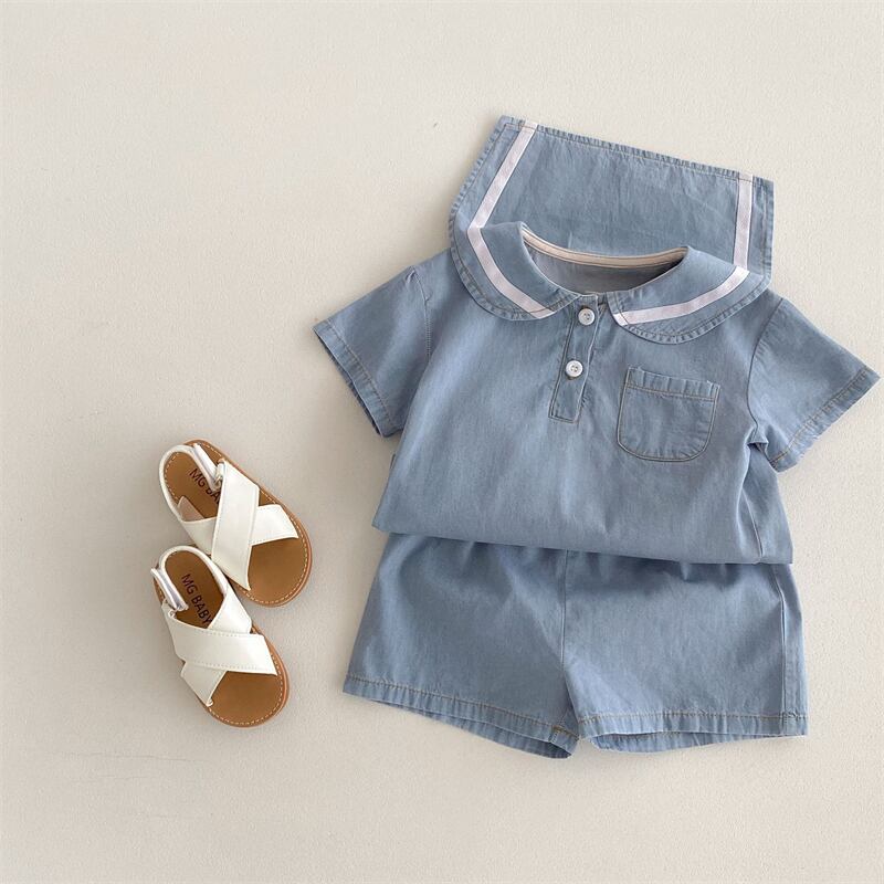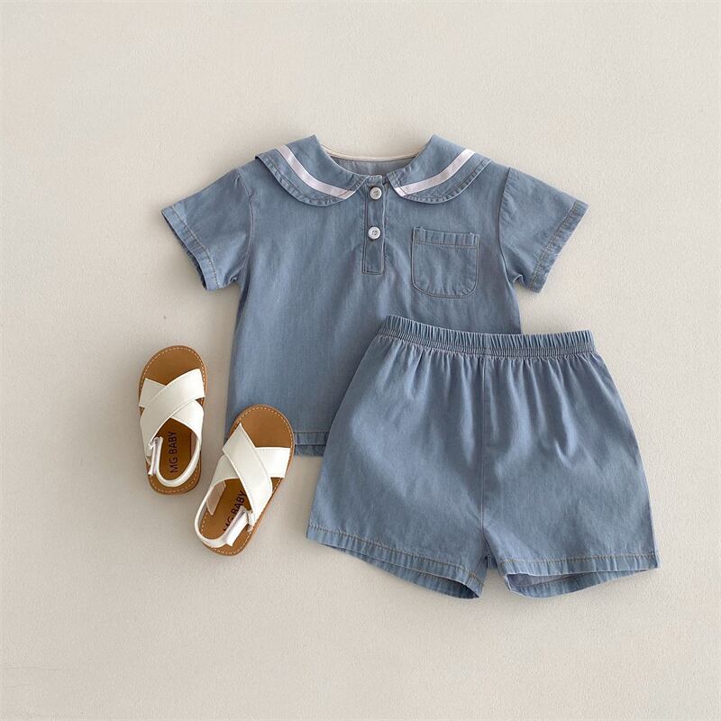 【海外からの取り寄せ】2024夏新作 子供服 デニム セーラーカラー セットアップ 半袖シャツ ショートパンツ 可愛い 柔らか #[ckd1093466_17400]【送料込み】【250517】
