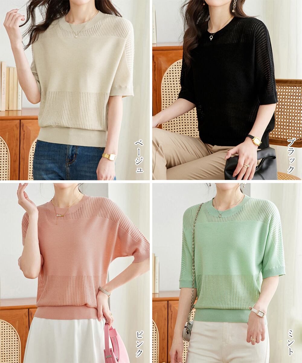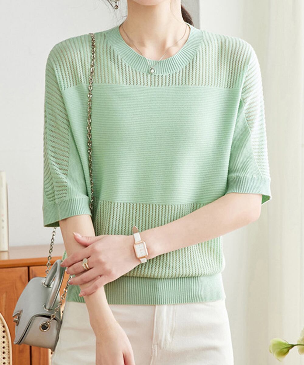 サマーニット レディース クールネック 薄手プルオーバー 透け感 無地 柔らかい シンプルニットソーお洒落 春夏