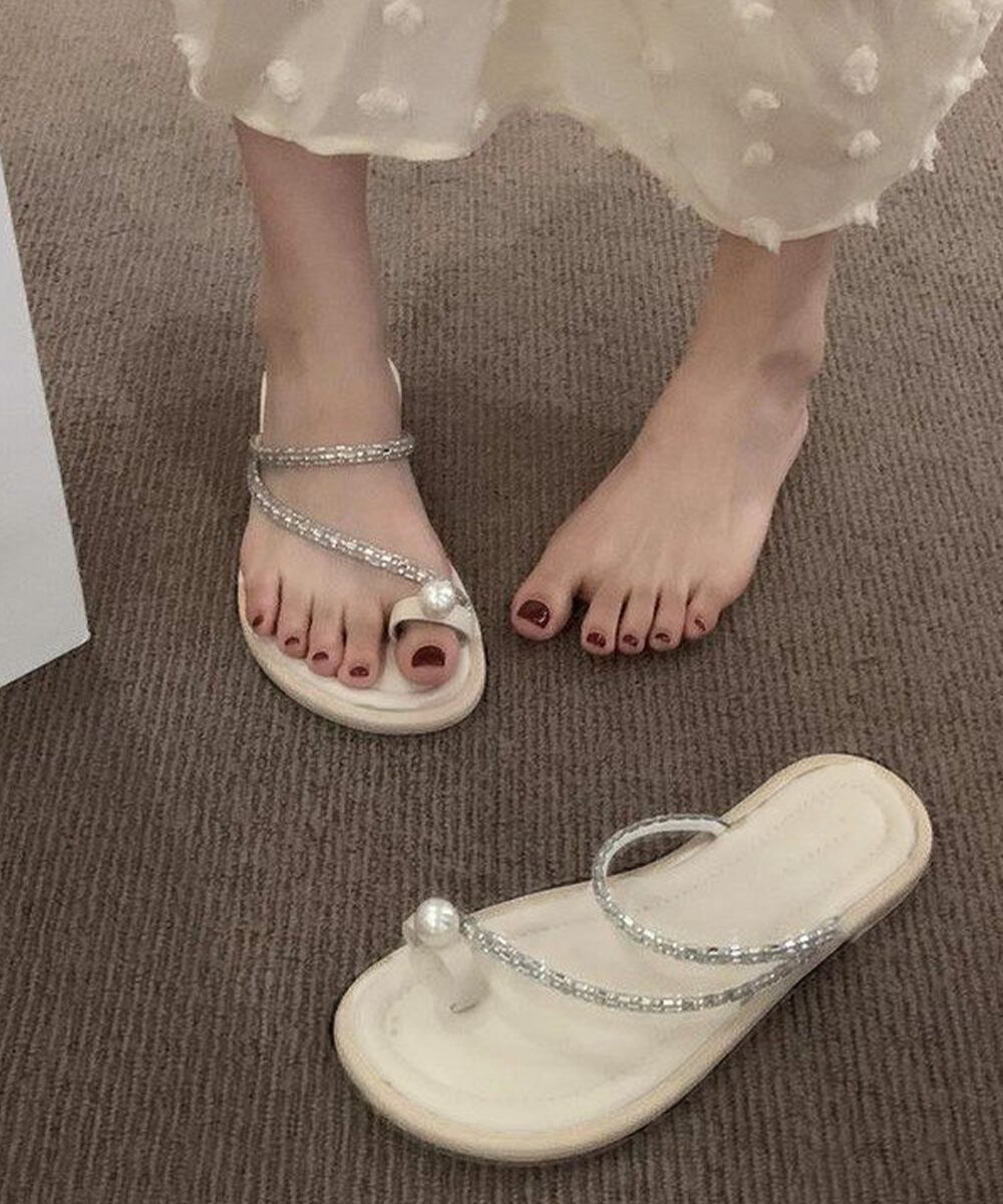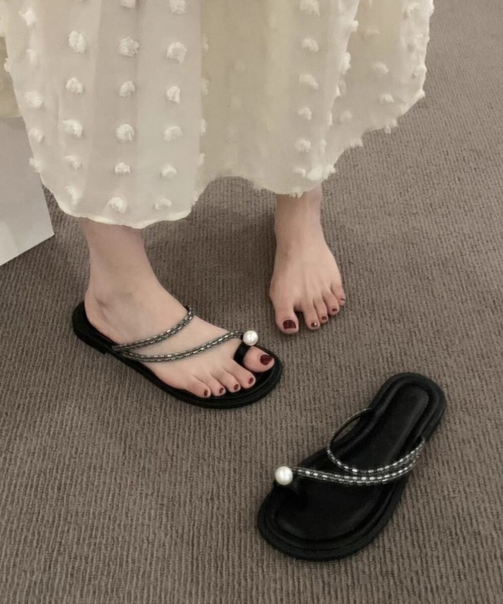 きらきら輝くビジューで飾られた細いストラップが、ヌーディーですっきりとした足元を演出する親指トングサンダル