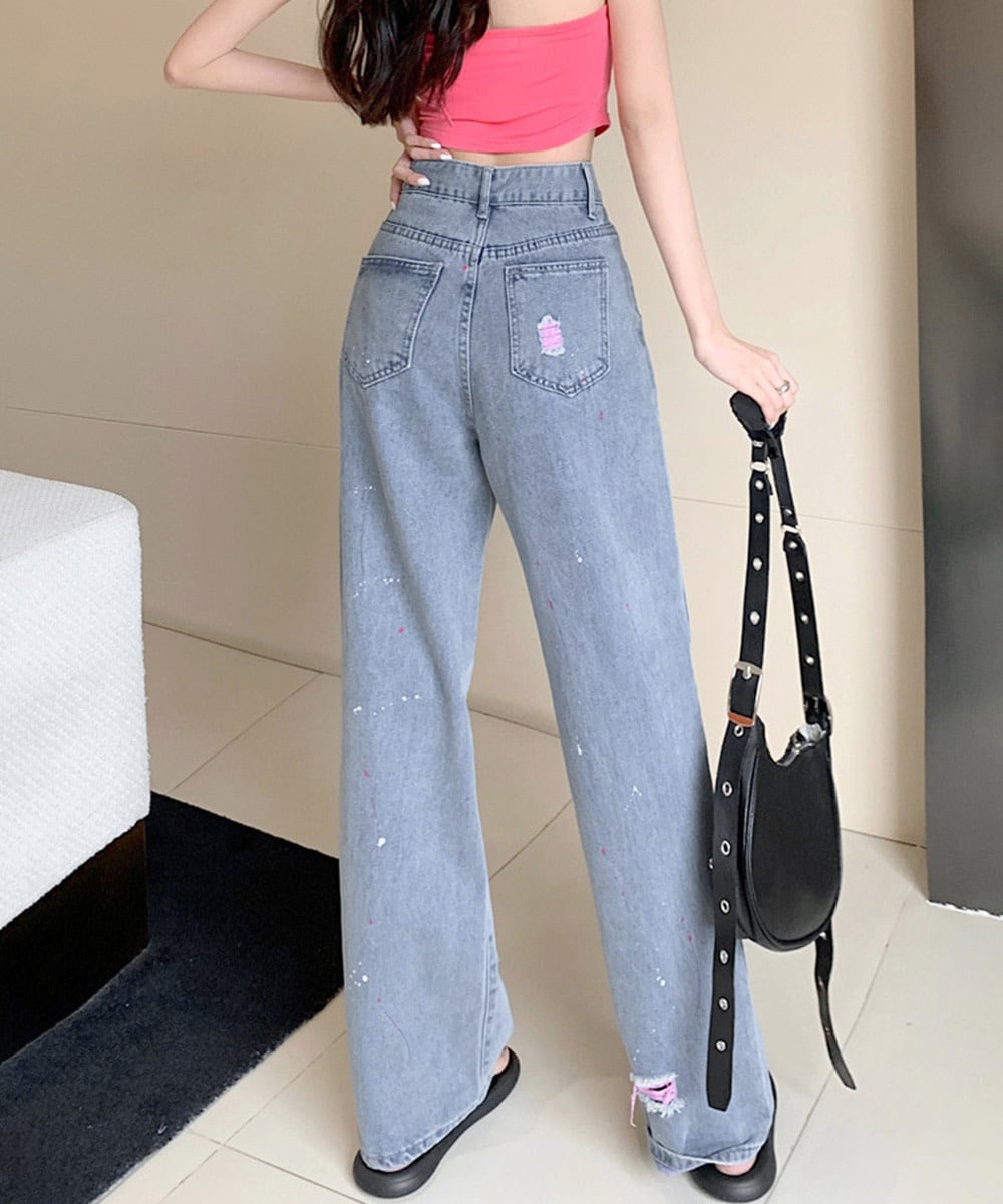 ストレートパンツ夏 ストリート お洒落 クラッシュジーンズ