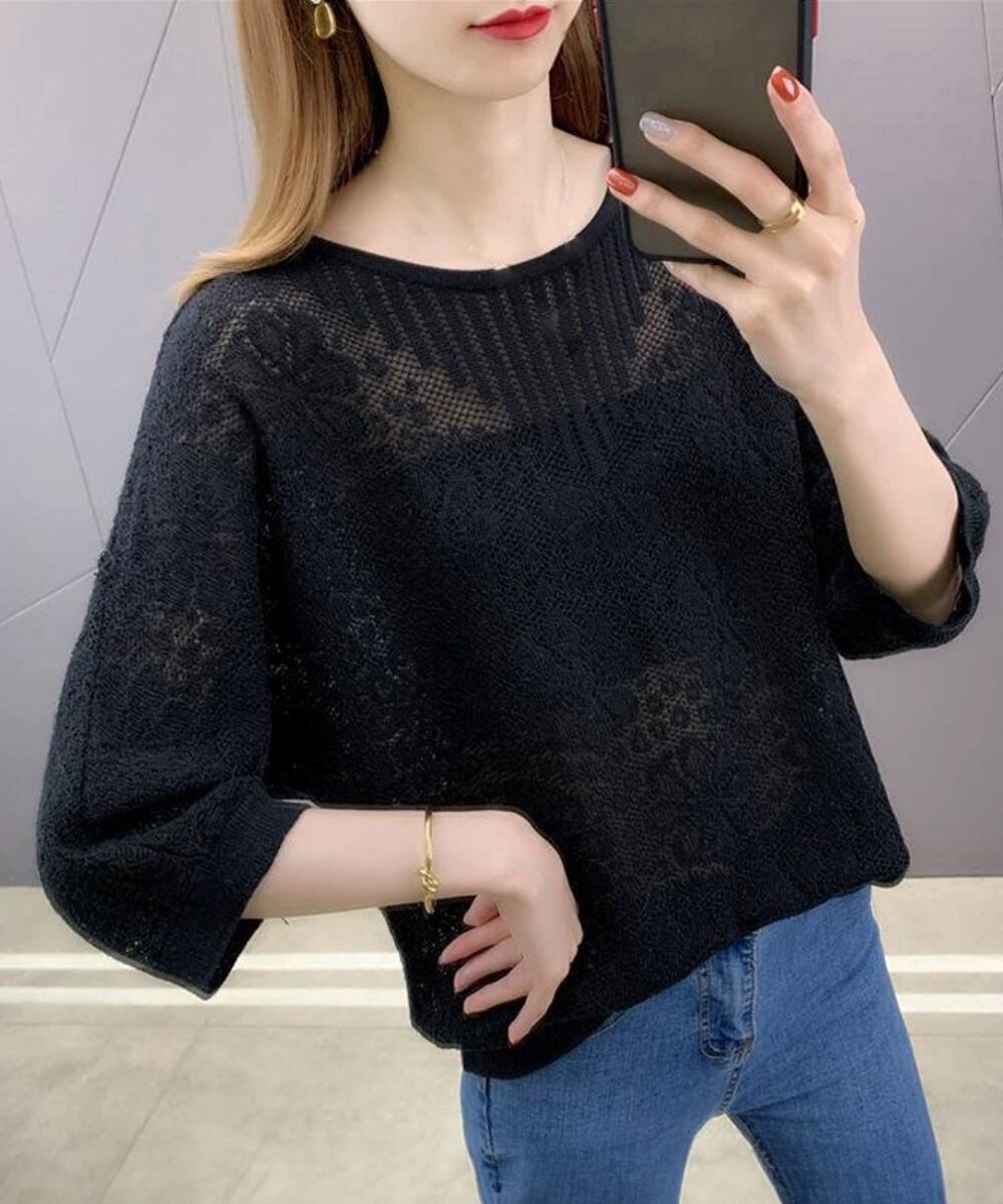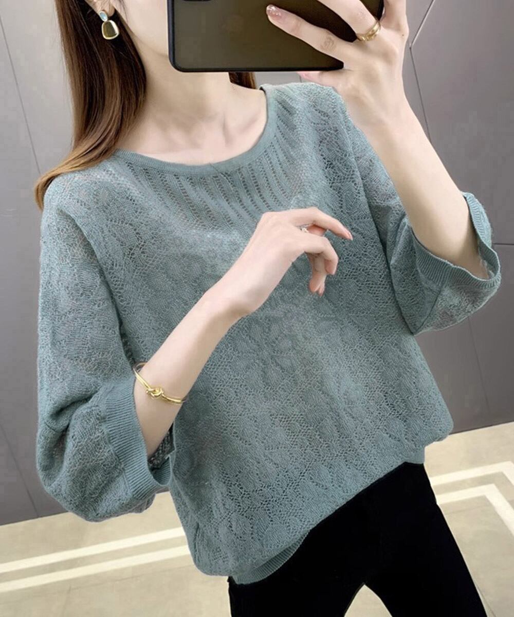 【日本倉庫からの発送】 サマーニット 七分袖透かし編みトップス #[24TPS-003_17400]【送料込み】【250607】