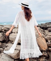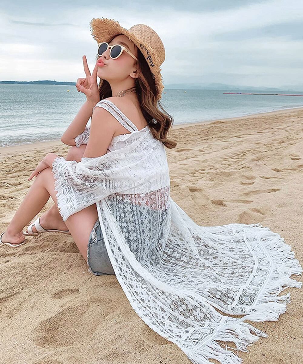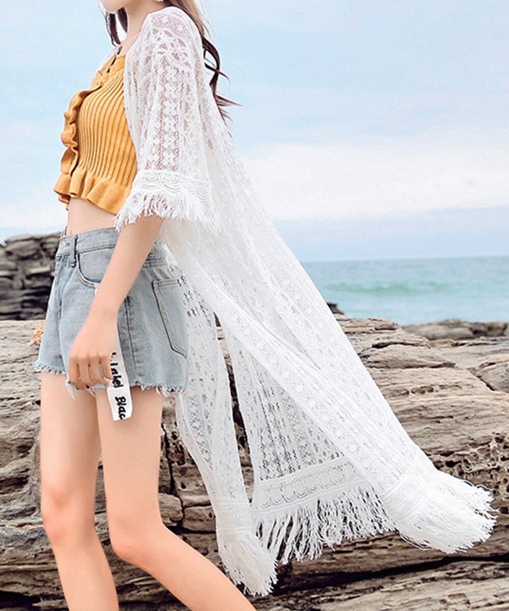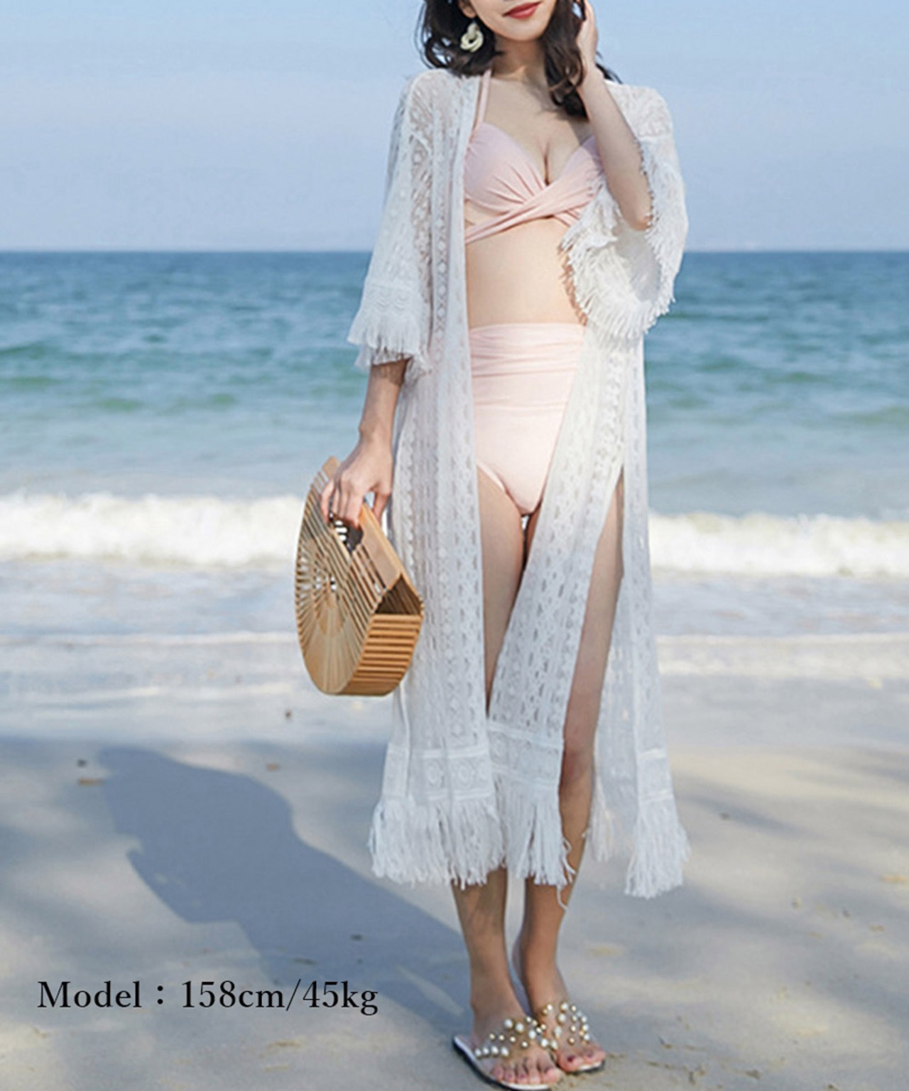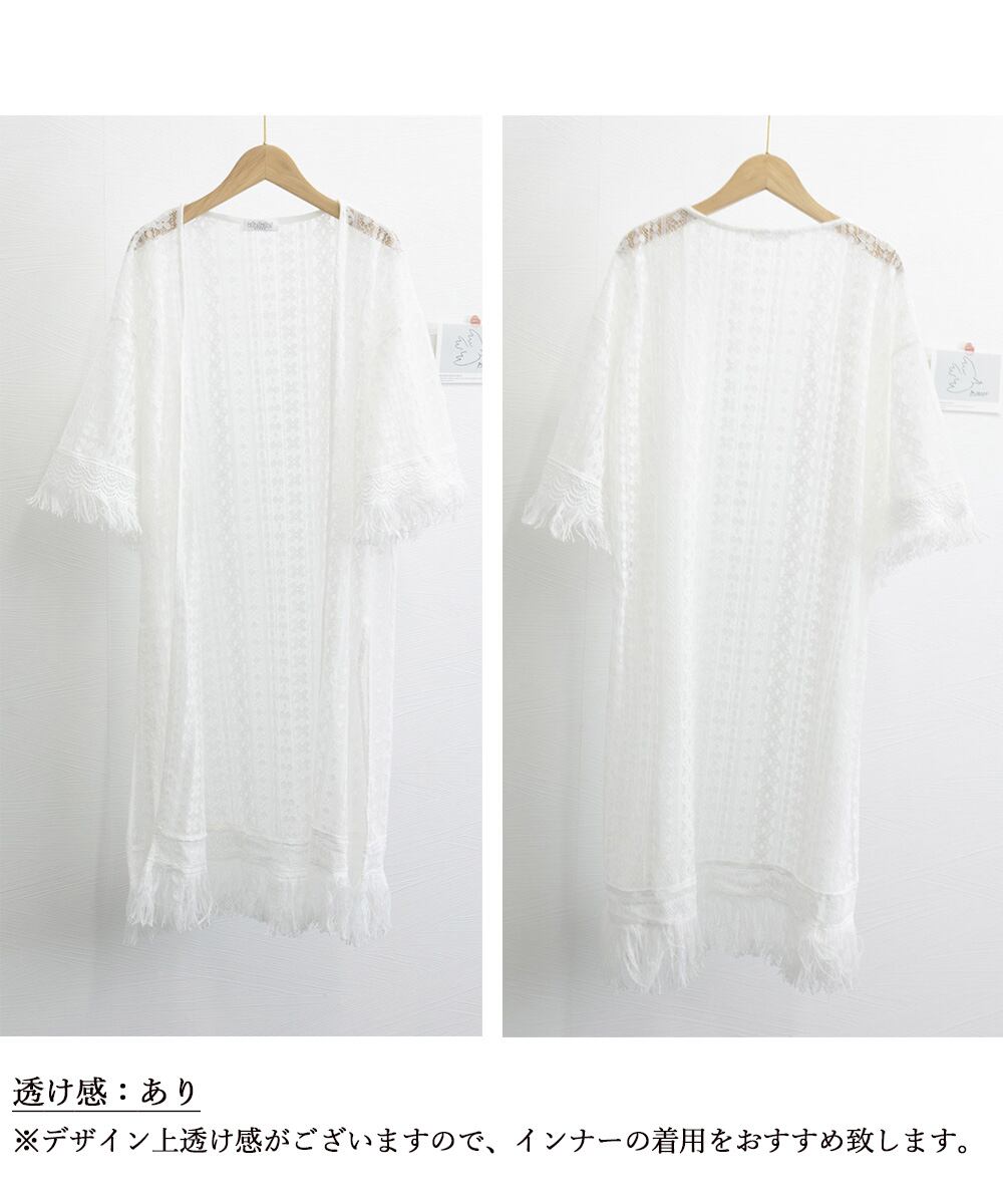 裾フリンジ ビキニカバー 透かし編み カーディガン スリット入り 体型カバーガウン レディース 薄手 レースサマーカーデ