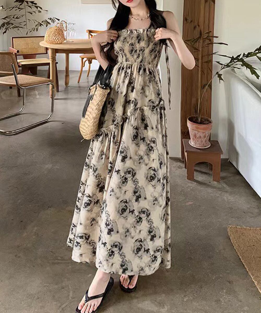 【日本倉庫からの発送】 花柄 キャミワンピース 胸元シャーリング #[80MYI-001_19000]【送料込み】【250515】