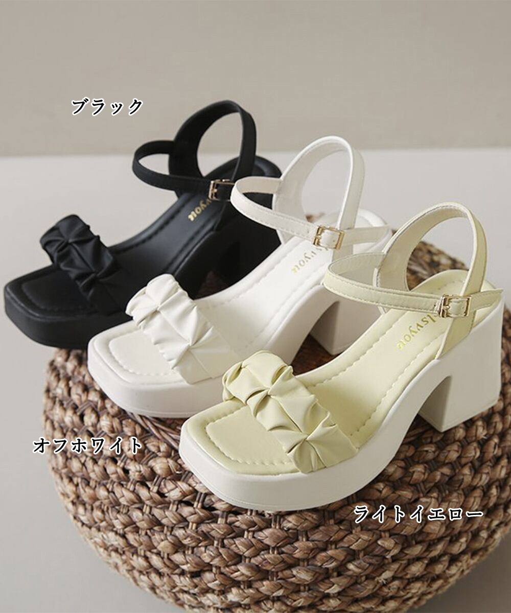 アッパーにはPUレザー素材を使用しており、ギャザーデザインがポイントのチャンキーヒールサンダル
